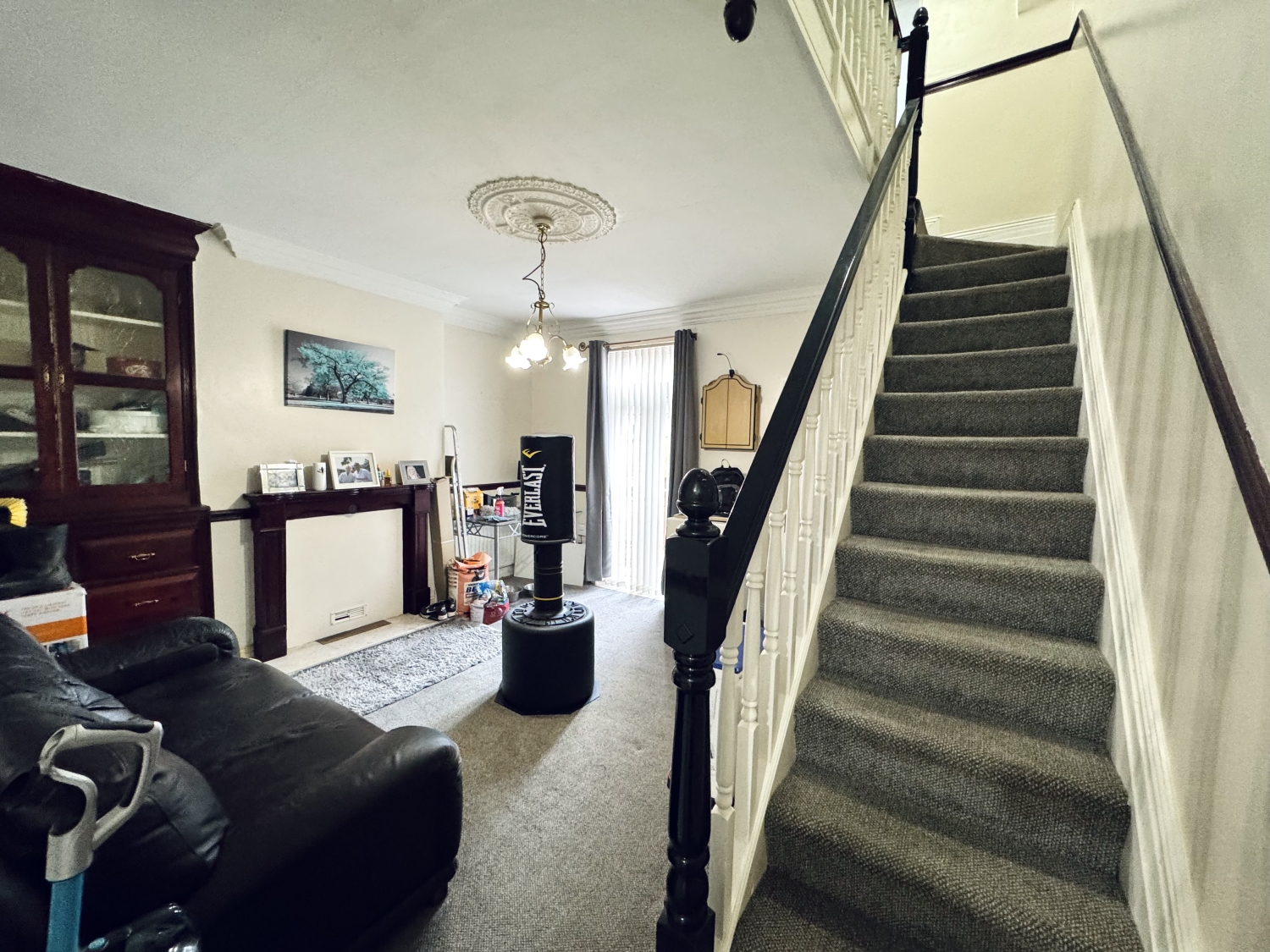 The ground floor begins with an entrance vestibule that leads into a welcoming entrance hall, where stairs rise to the first‑floor landing. To the front sits a comfortable living room, while a separate dining room or second reception room lies to the rear, enjoying natural light and direct access to the outdoor space through patio doors. The kitchen is positioned beyond this, fitted with a UPVC door that opens into the rear yard, creating a practical flow for everyday living.