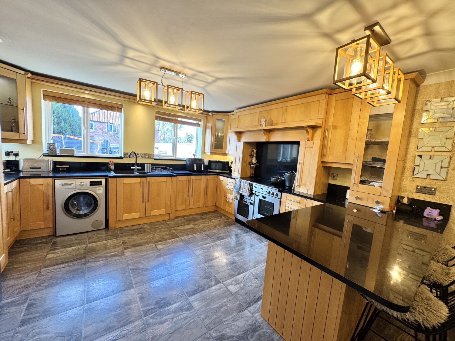 Fitted with a range of wall and base units with complementing work surfaces and breakfast bar, cooker which includes 6 ring electric hob, double electric oven and warming tray, extractor hood, dishwasher, composite sink with drainer and mixer tap, space for American fridge/freezer, space for washing machine, radiator, two double glazed window to the rear elevation