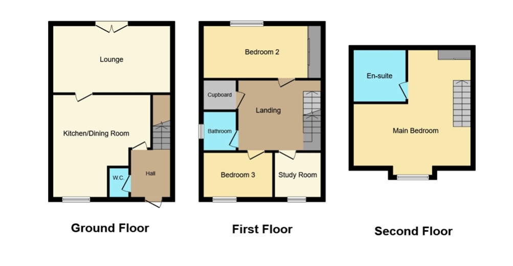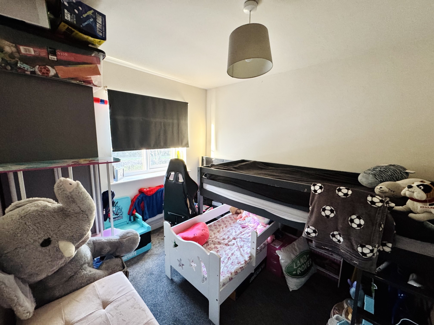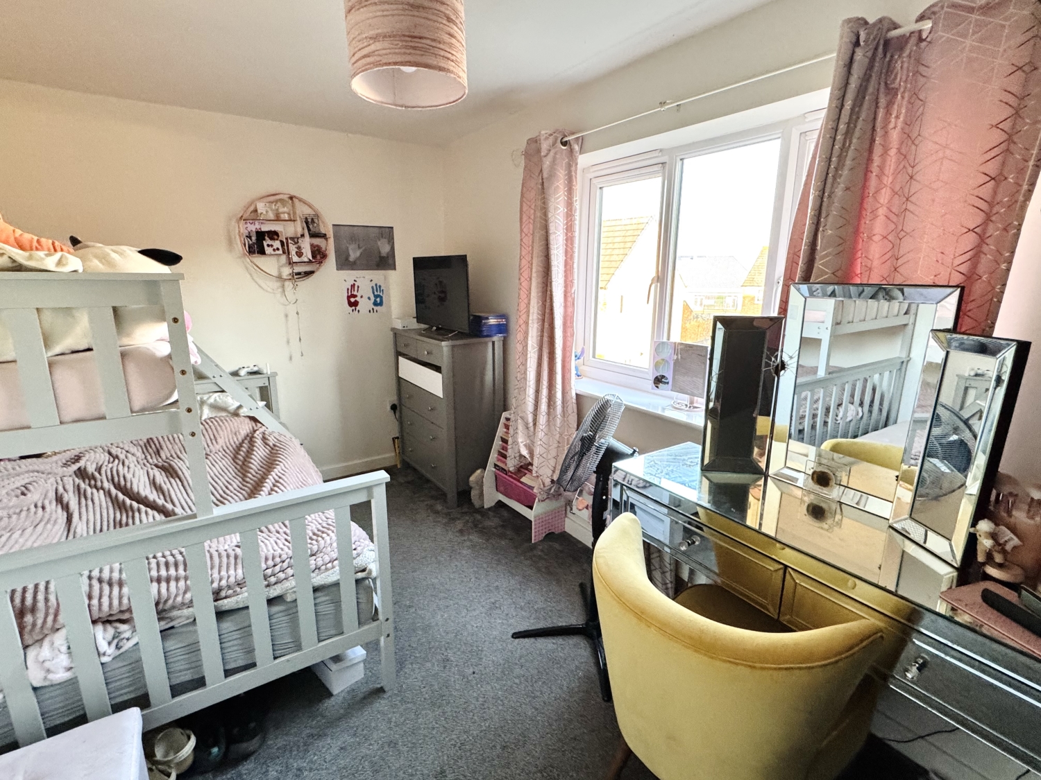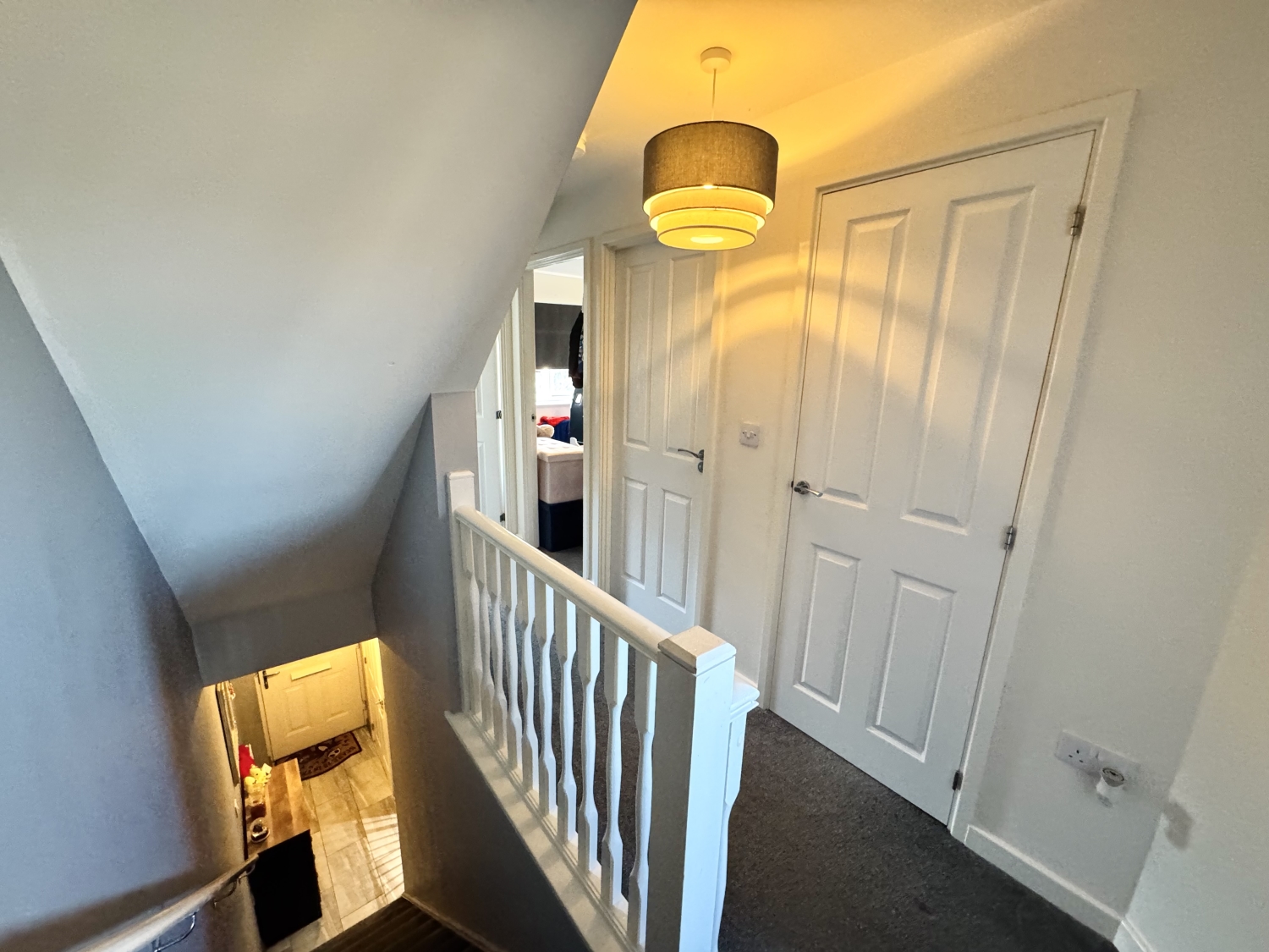 The first‑floor landing offers additional storage and leads to bedrooms two and three, both comfortably sized and suitable for family living, guests or hobbies. A contemporary family bathroom serves this floor and is fitted with a modern suite. Also located on this level is a versatile office or study, ideal for remote working or quiet focus, with its own staircase rising to the second floor.