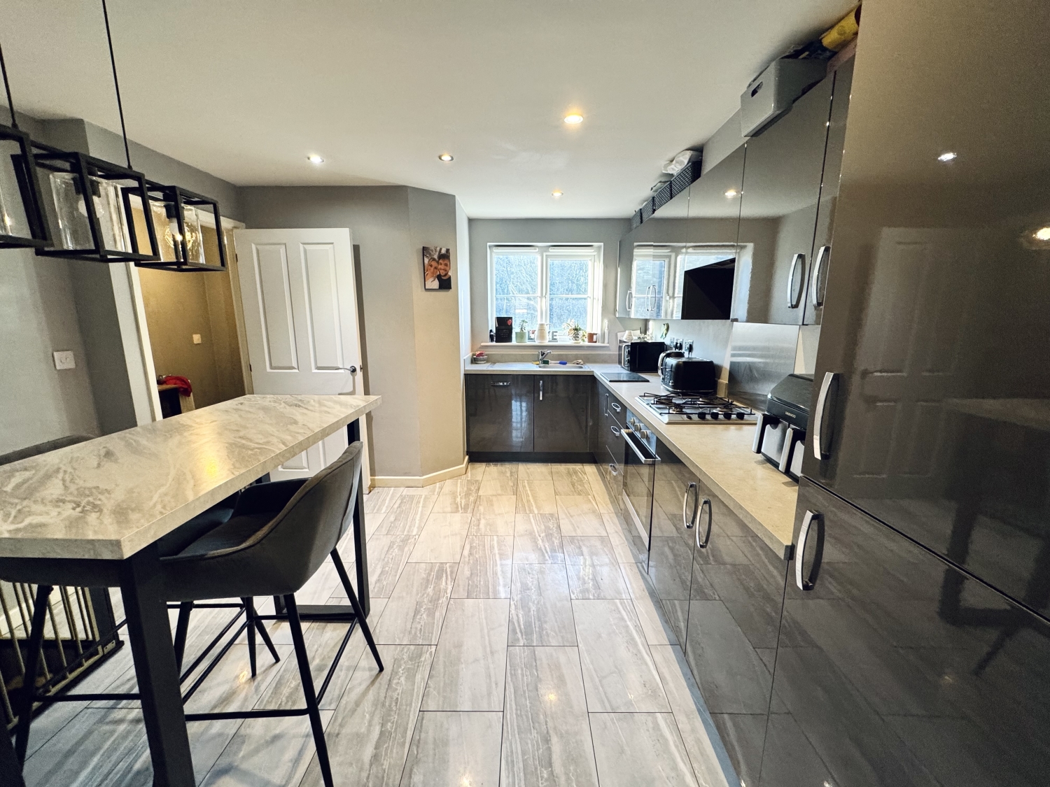 Fitted with a range of wall and base units with complementing work surfaces, integrated fridge/freezer, dishwasher, washing machine, gas hob, electric oven, extractor hood, stainless steel sink with drainer and mixer tap, radiator, tiled flooring, double glazed window to the front elevation