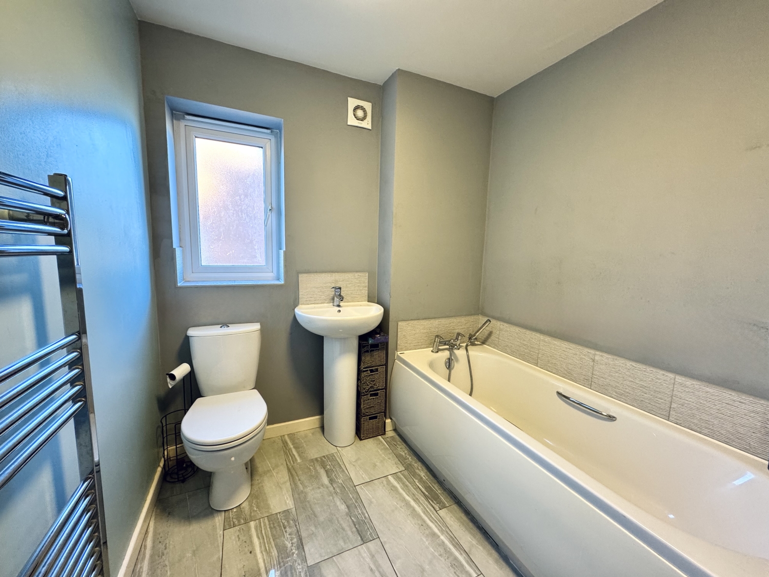 Fitted with a 3 piece suite comprising of; Bath, pedestal wash hand basin, low level w/c, heated towel rail, extractor fan, double glazed window to the side elevation