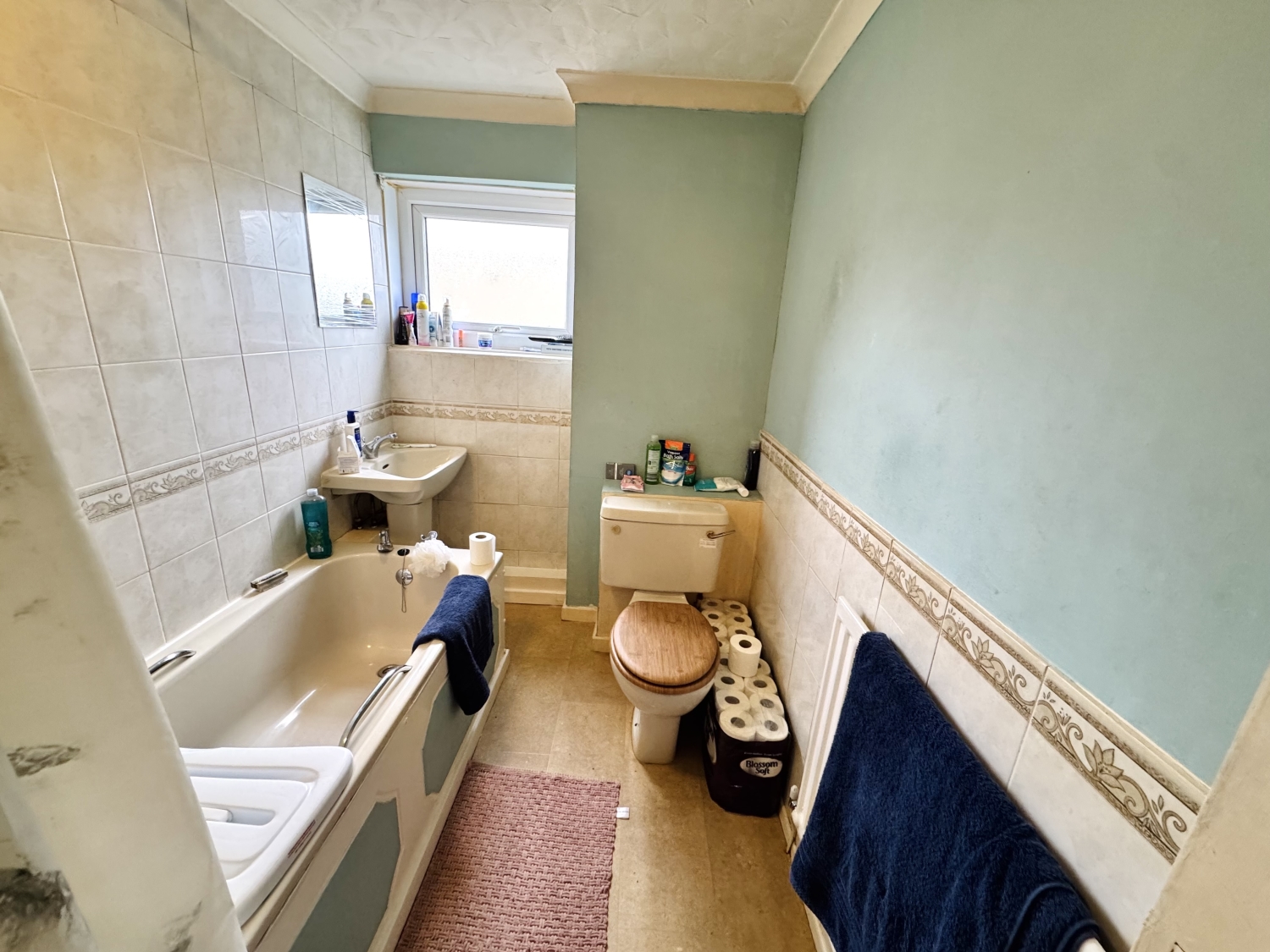 Fitted with a 3 piece suite comprising of; Bath with overhead shower, pedestal wash hand basin, low level w/c, radiator, double glazed window to the rear elevation