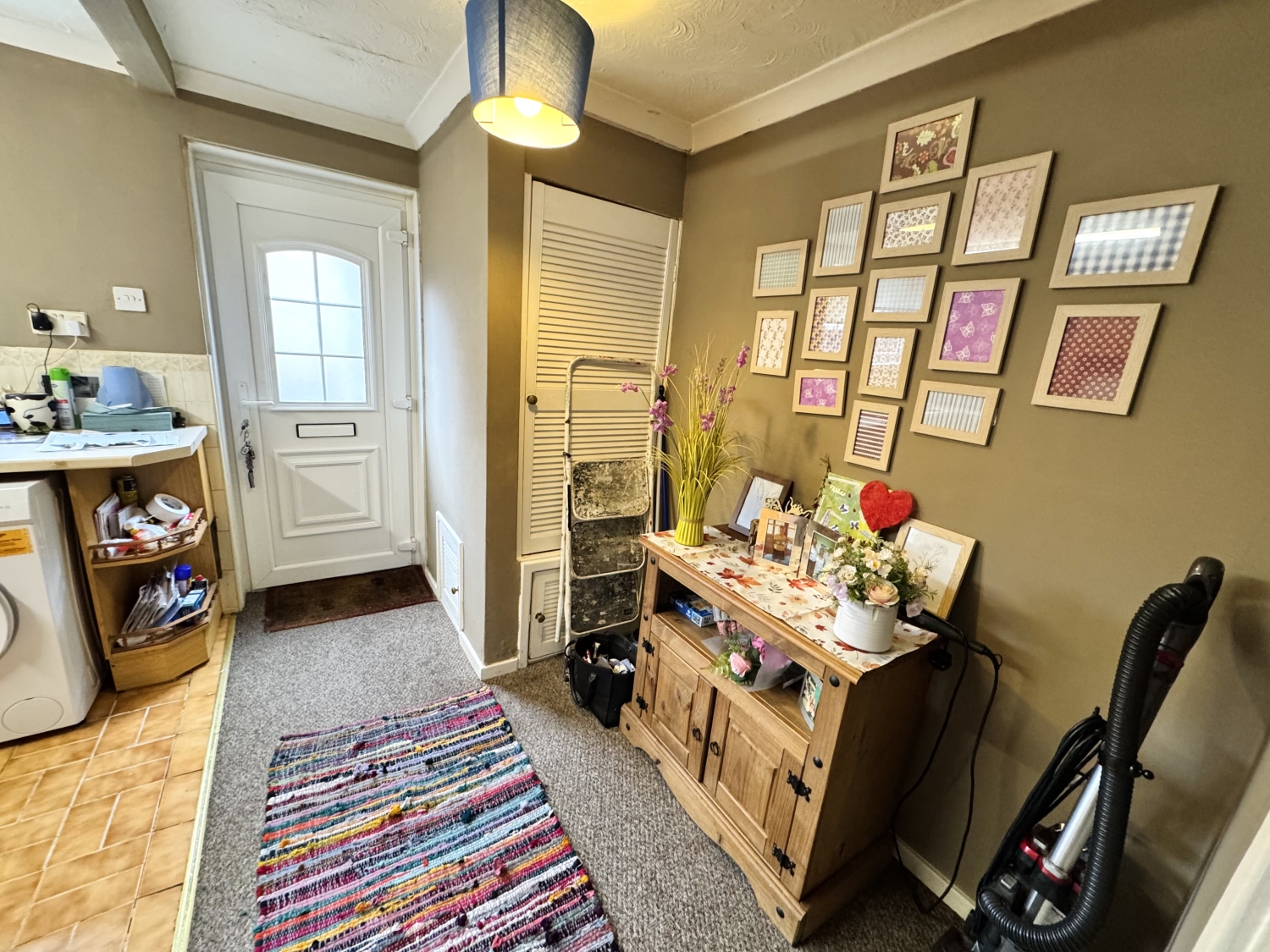 Fitted with a range of wall and base units with work surfaces, stainless steel sink with drainer and dual tap, space for fridge/freezer, space for cooker, extractor hood, space for washing machine, radiator, storage cupboard, double glazed window to the rear elevation, upvc door to the rear yard