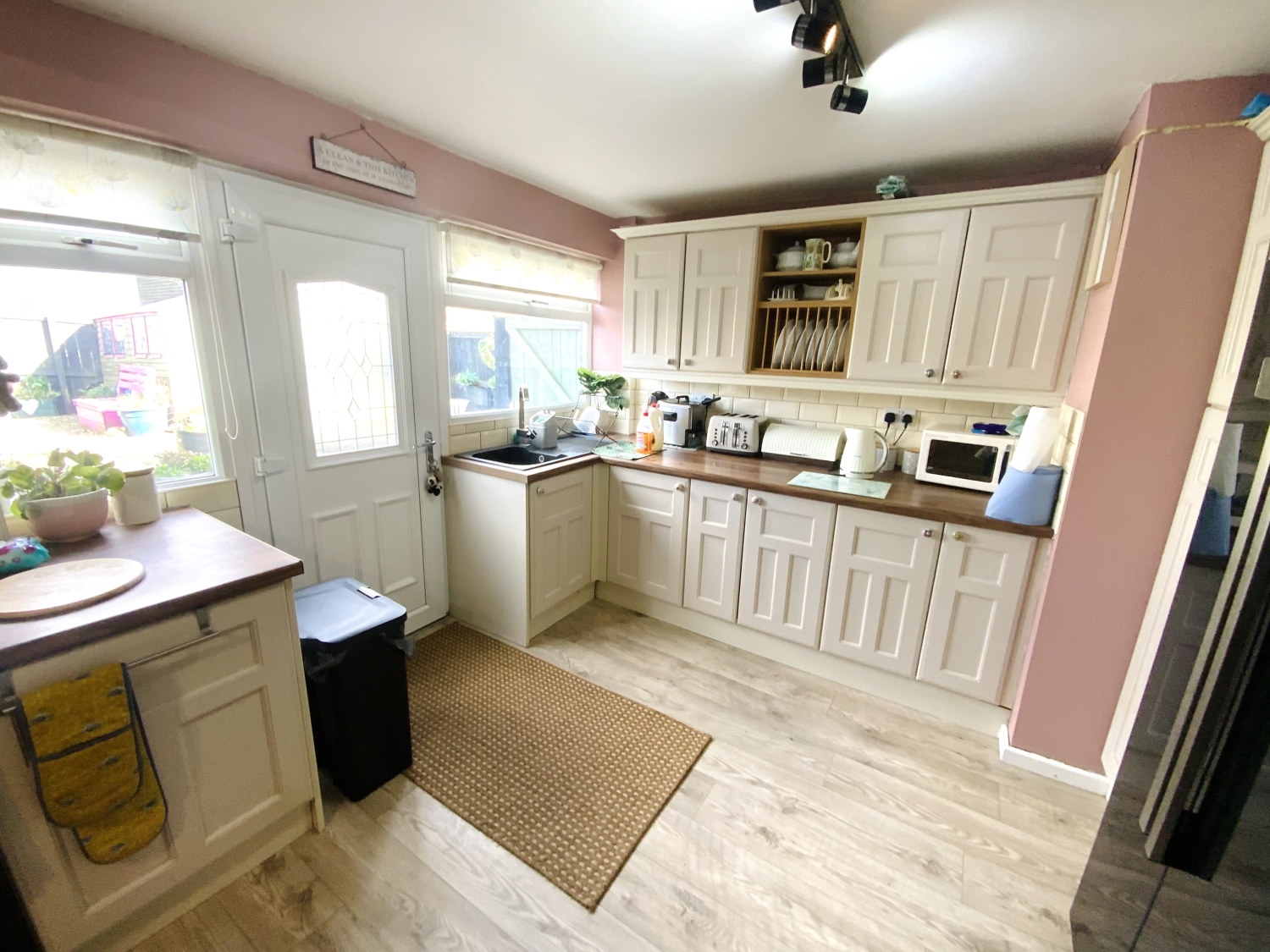 Fitted with a range of wall and base units with complementing work surfaces, splash back tiling, composite sink with drainer and mixer tap, gas hob, double electric oven, fridge/freezer, space for washing machine, space for dryer/dishwasher, radiator, three double glazed windows to the side elevation, upvc door to the garden