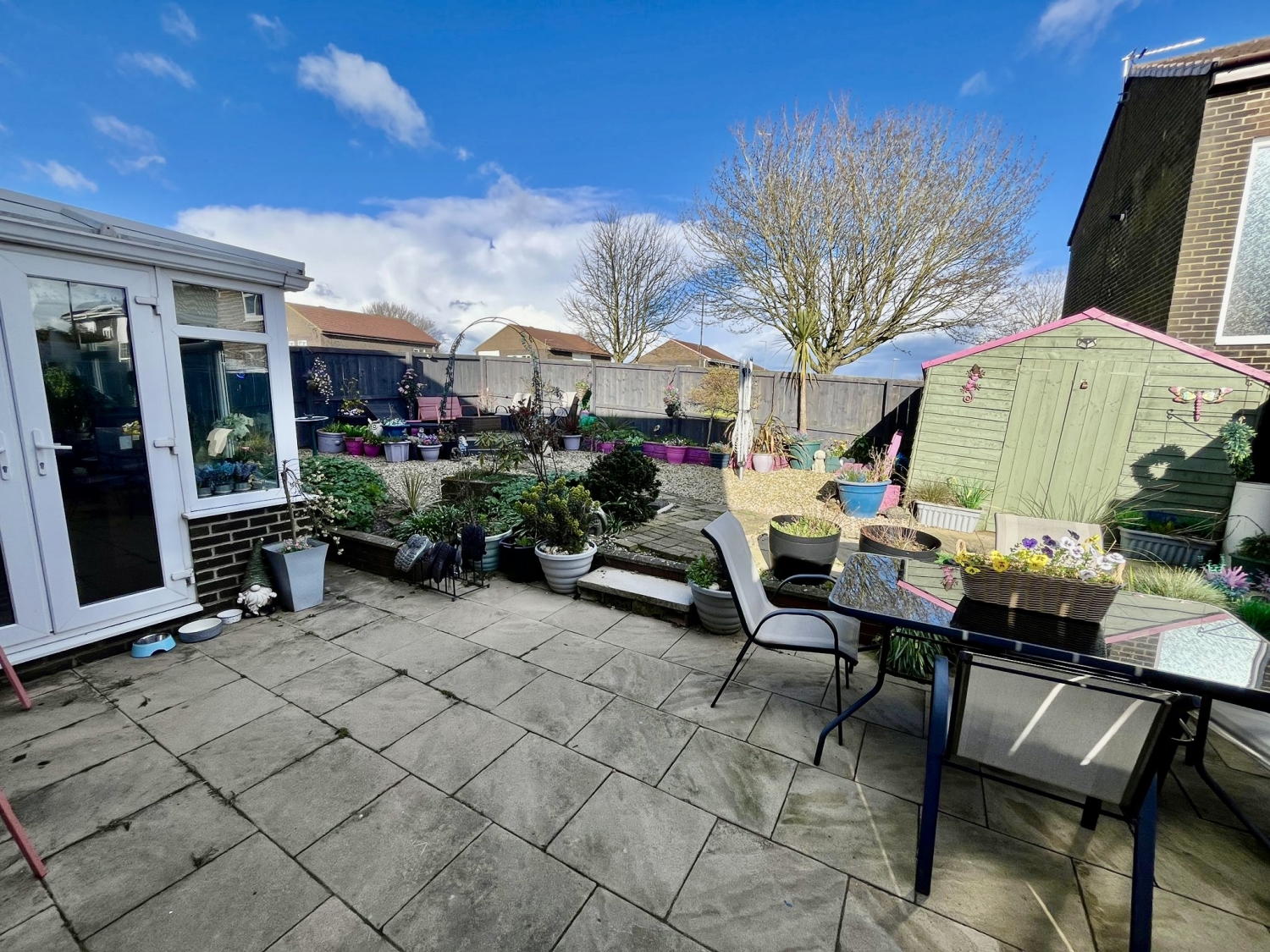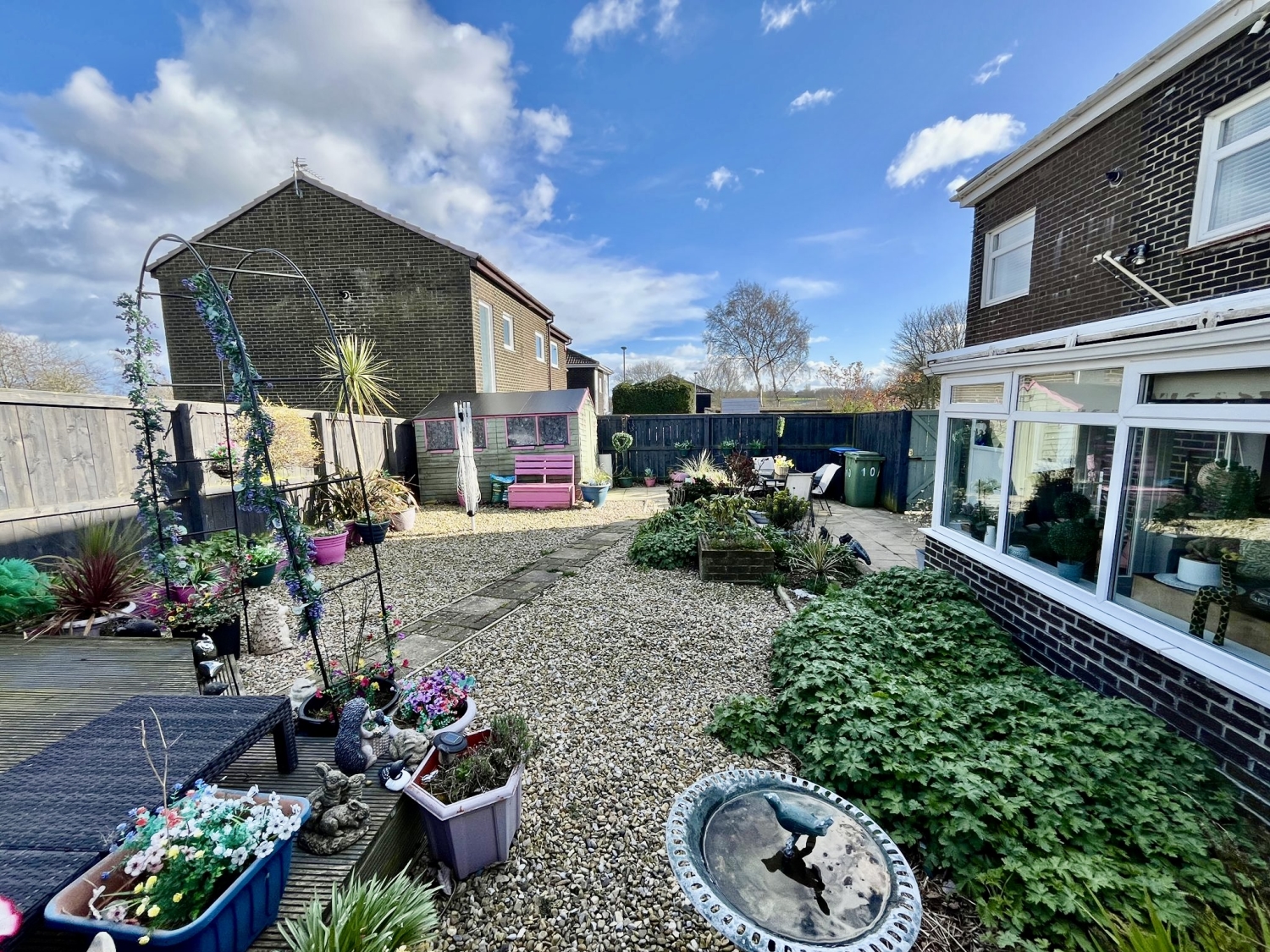 The garden is designed for enjoyment and ease of maintenance, featuring a blend of gravelled sections, a decked area ideal for seating, a patio area perfect for outdoor dining, raised beds for planting, and a garden shed. Outdoor lighting adds practicality and ambience, making the space usable throughout the year.