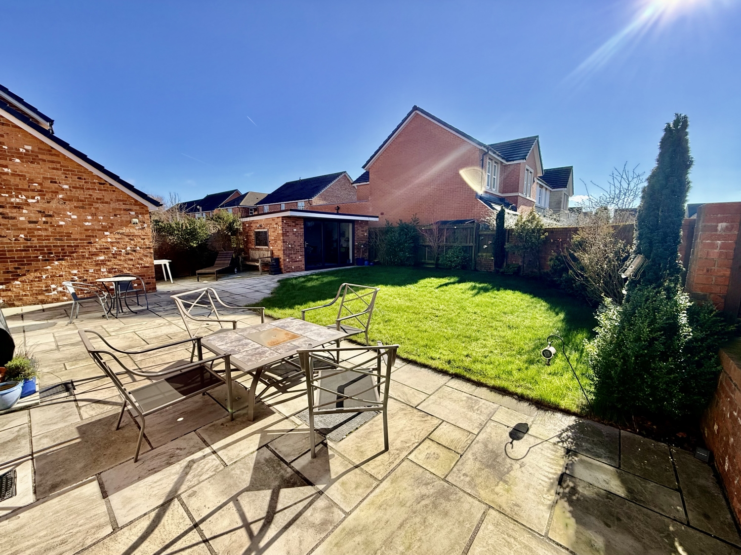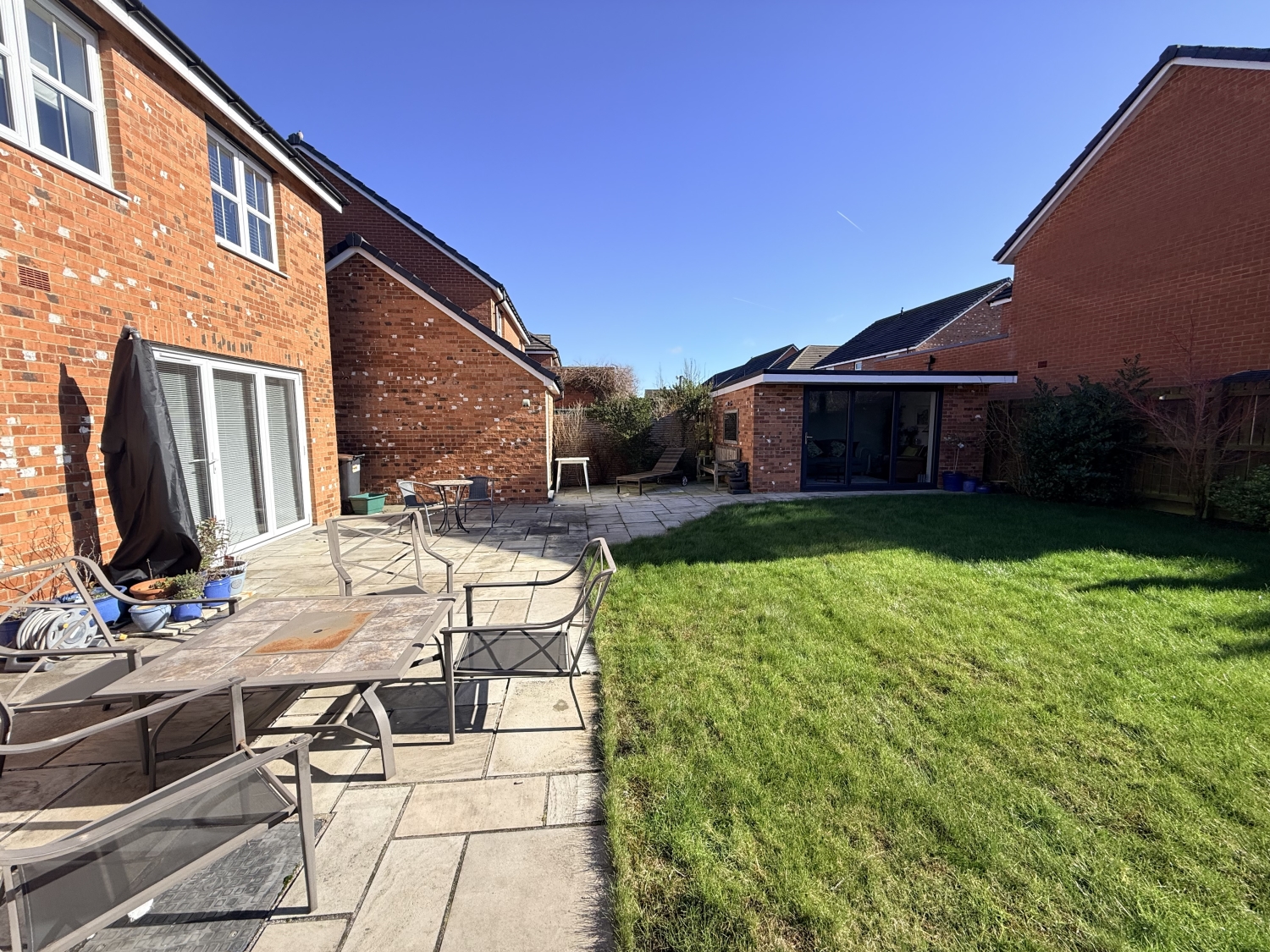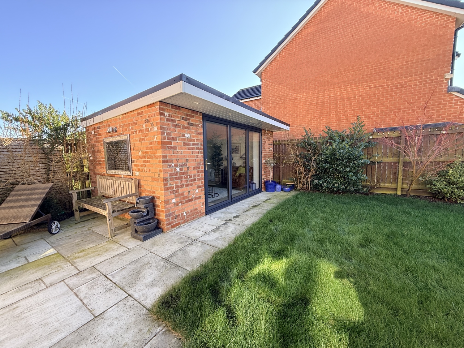 Externally, the property provides ample off‑street parking to the front, additional parking in front of the garage, and a beautifully landscaped rear garden with a patio—perfect for relaxing or entertaining. The rear also benefits from a superb detached structure currently used as a garden room but could be used as a home office/gym with stunning bio folding doors opening onto the landscaped corner plot.