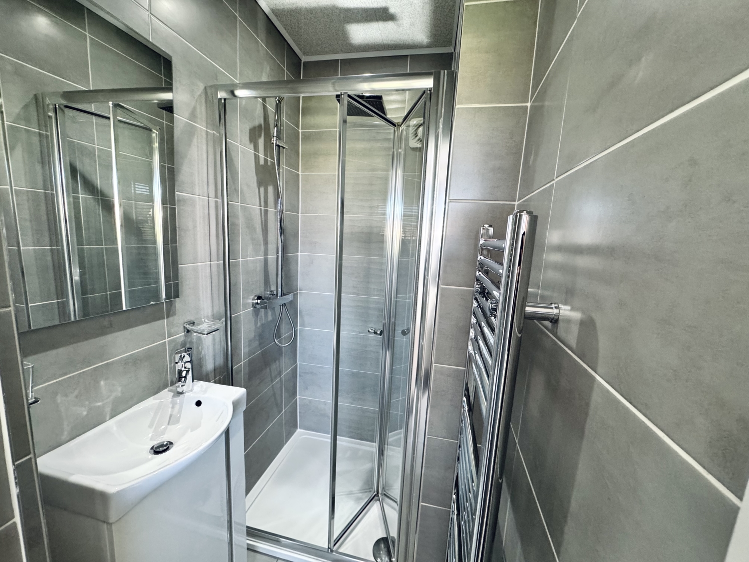 Fitted with a 2 piece suite comprising of; Shower cubicle, vanity wash hand basin, heated towel rail, extractor fan, spotlights to ceiling, tiled flooring, tiled walls