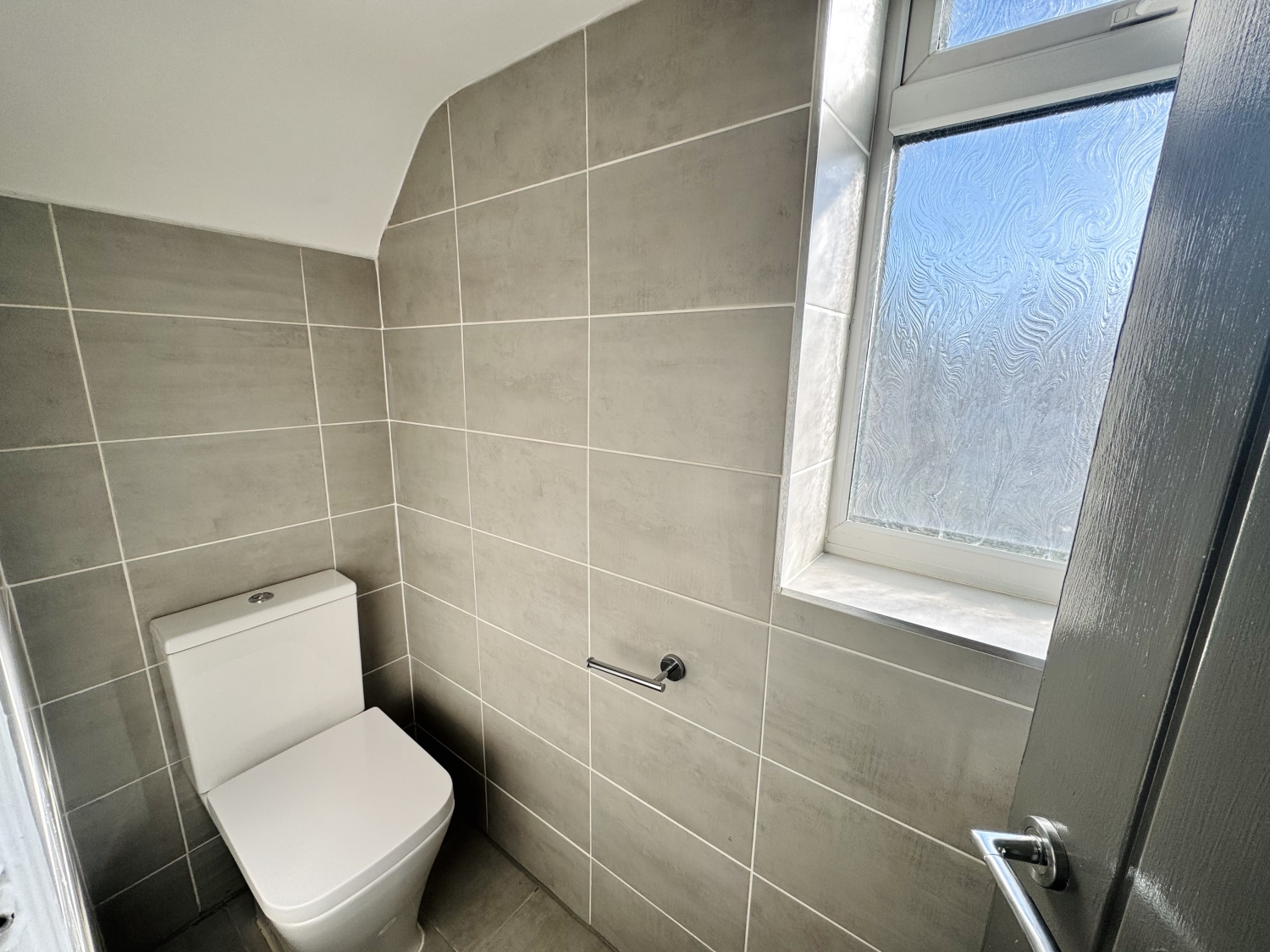 Low level w/c, wash hand basin, double glazed window to the rear elevation, tiled walls, tiled flooring