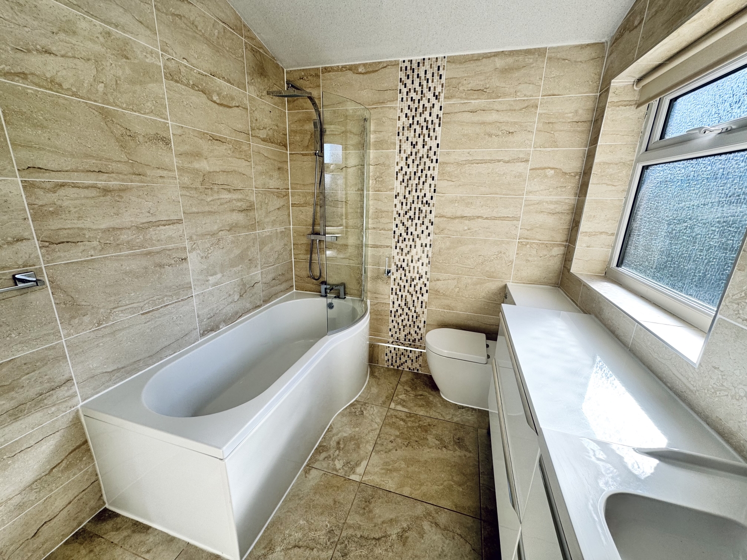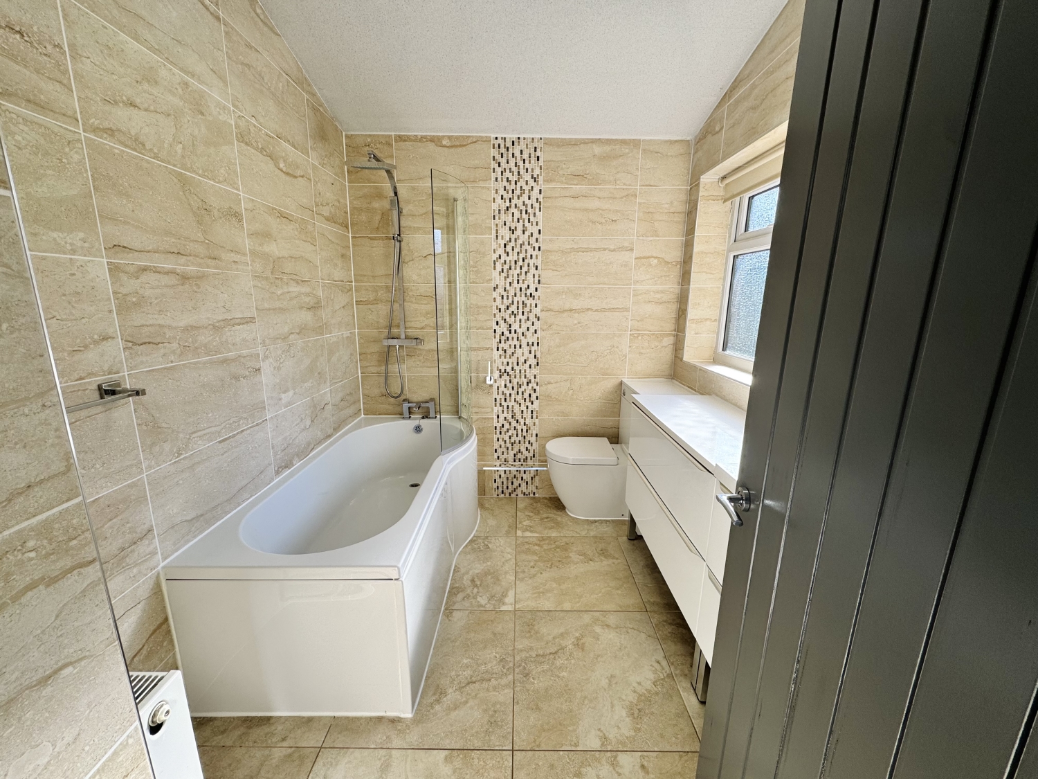 The ground floor also includes a modern three‑piece bathroom complete with bath, overhead shower, vanity wash hand basin and a double‑glazed window to the side elevation.