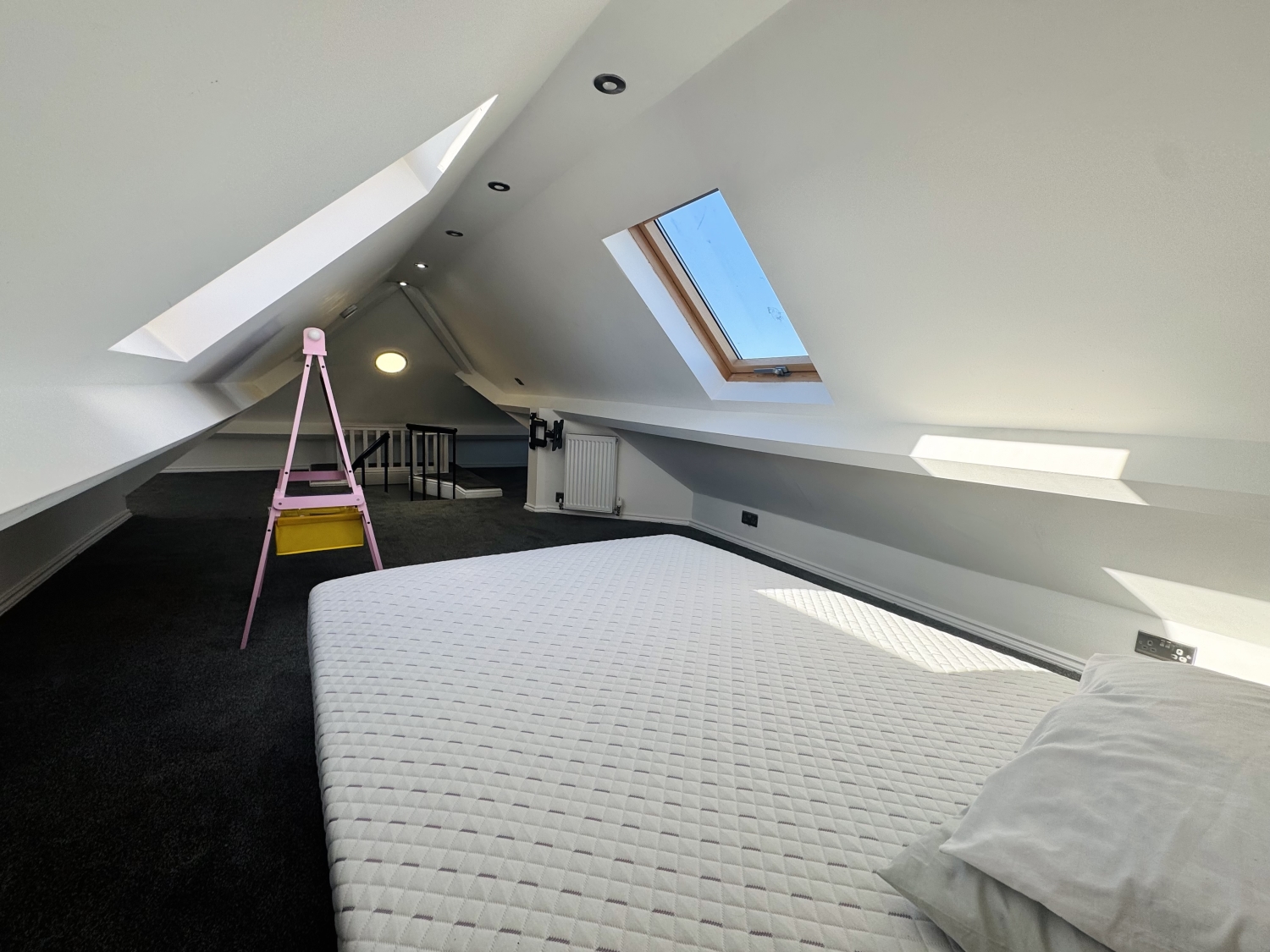 The first floor offers three well‑proportioned bedrooms, including a master bedroom with its own modern en‑suite, along with a separate WC accessed from the landing. From here, a spiral staircase leads up to the remarkable 23ft loft room, a superb additional living space featuring Velux windows to both the front and rear, circular feature windows, heating and spotlights. This expansive room is ideal as a home office, hobby room, guest space or teenage retreat.