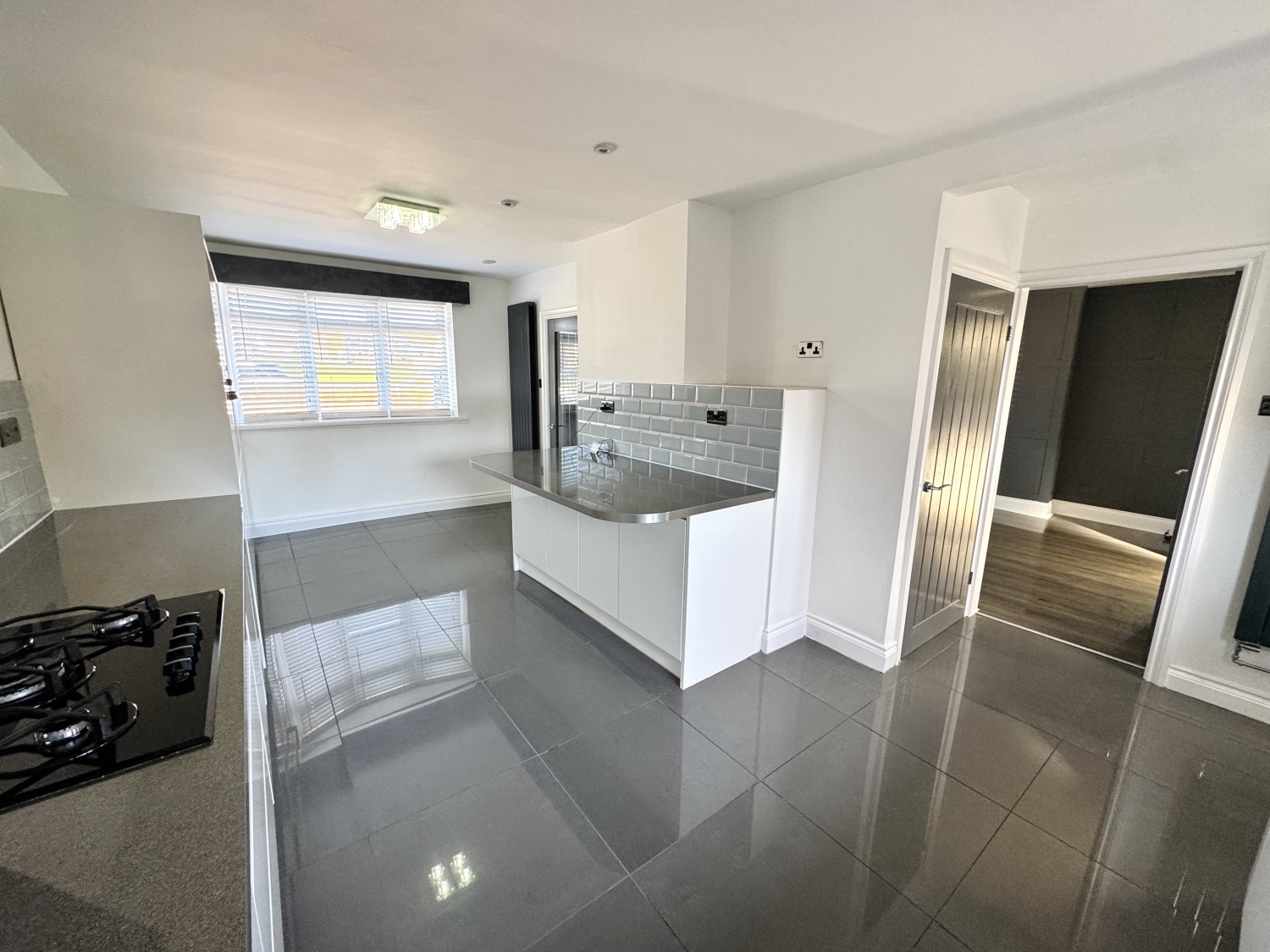 Fitted with a range of Wren wall and base units with complementing work surfaces, breakfast bar, splash back tiling, 5 ring gas hob, extractor hood, electric oven, integrated fridge/freezer, washing machine, dryer, composite sink with drainer and mixer tap, 2 vertical radiators, tiled flooring, spotlights to ceiling, storage cupboard, double glazed windows to both the front and rear elevation, upvc door to the rear garden