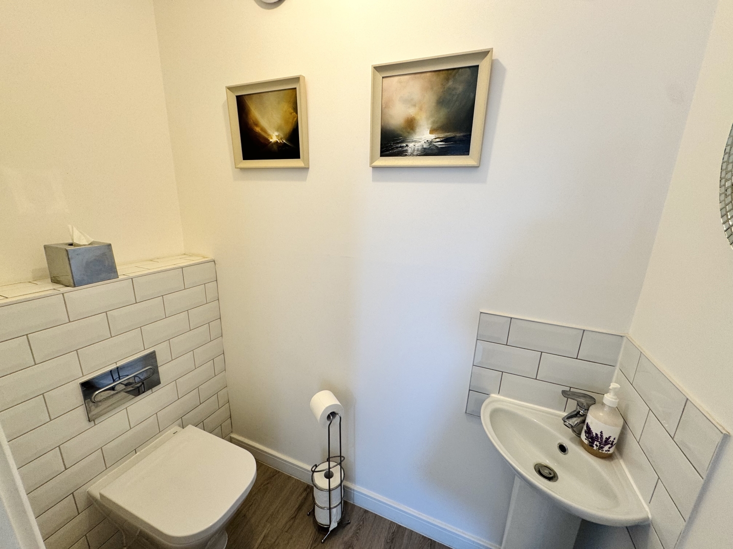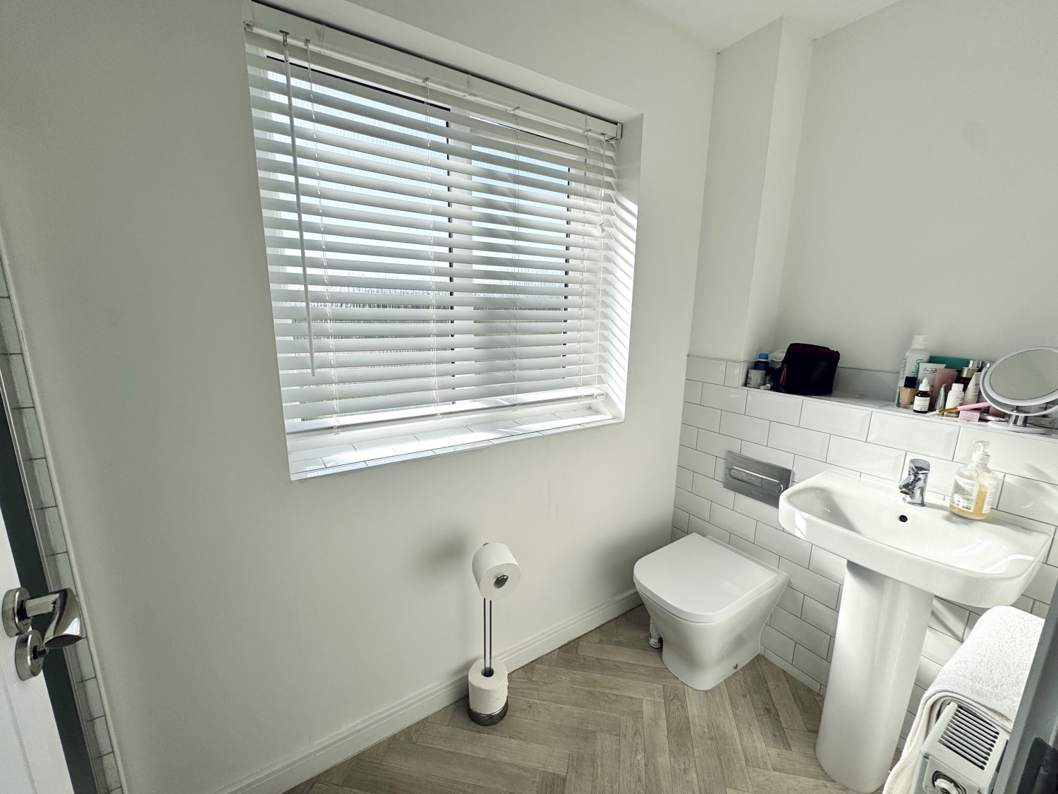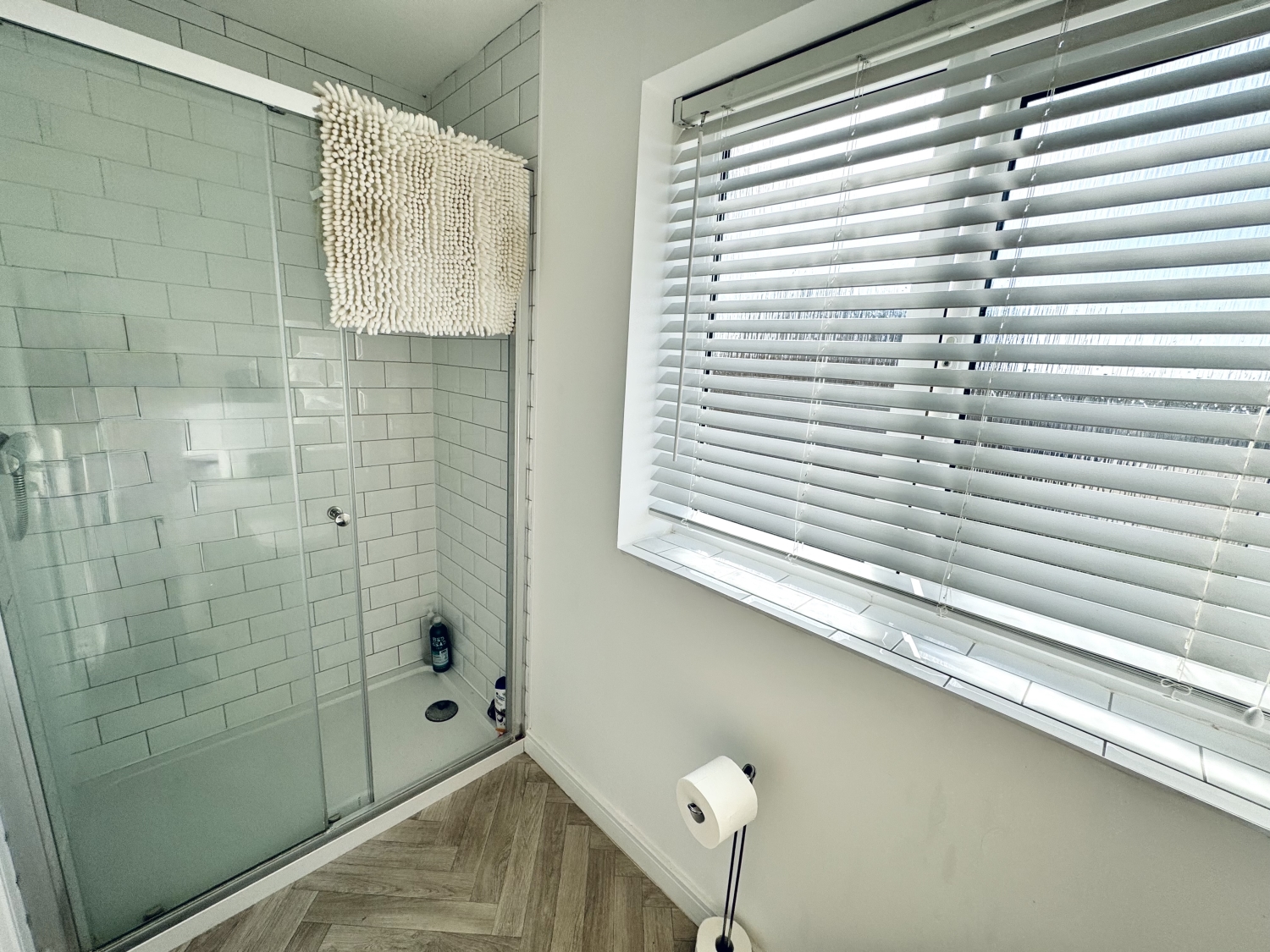 Fitted with a 3 piece suite comprising of; Double shower, pedestal wash hand basin, low level w/c, radiator, part tiled walls, double glazed window to the side elevation