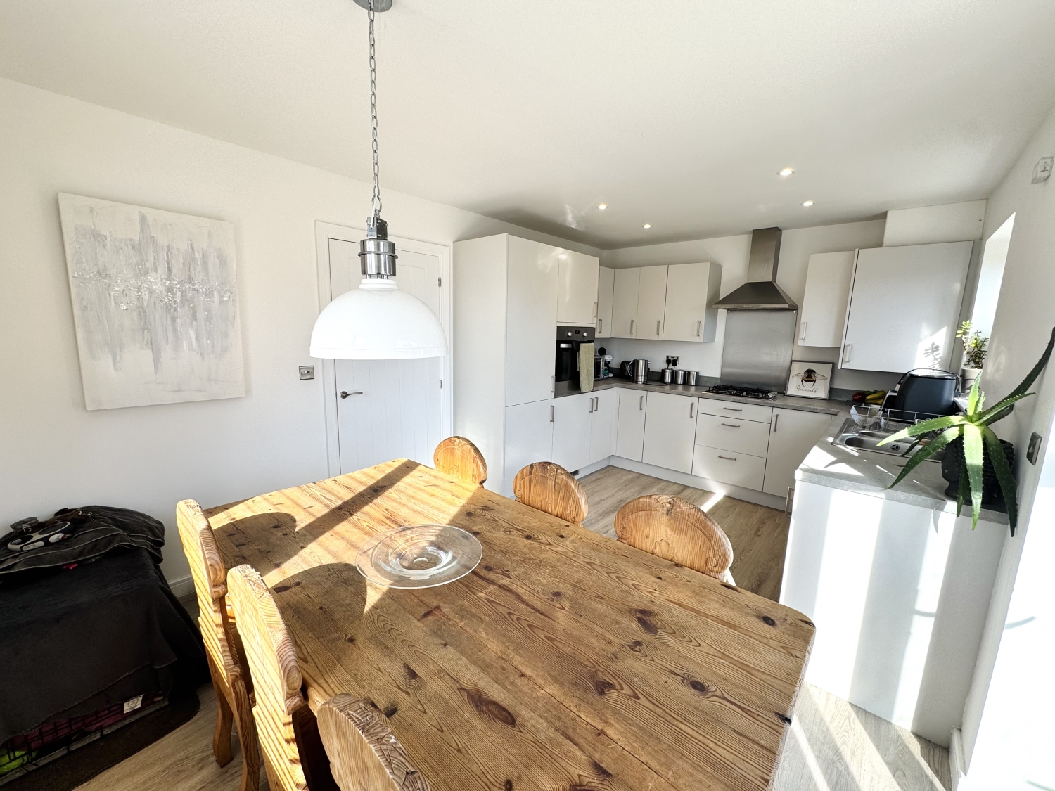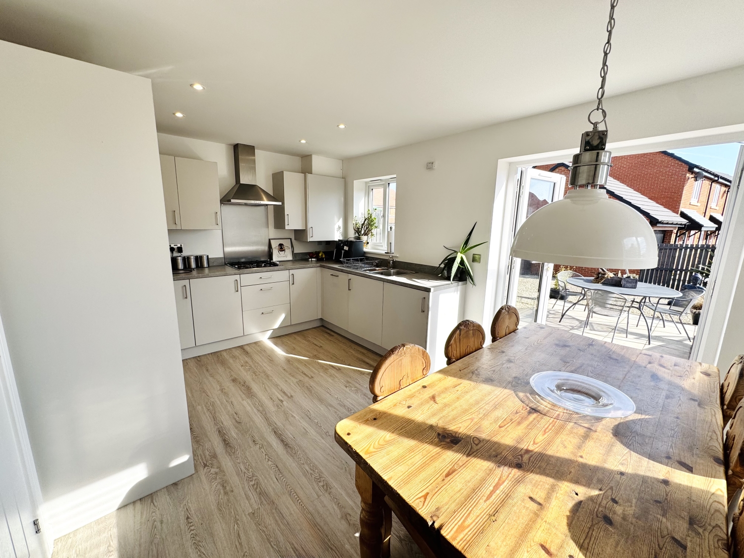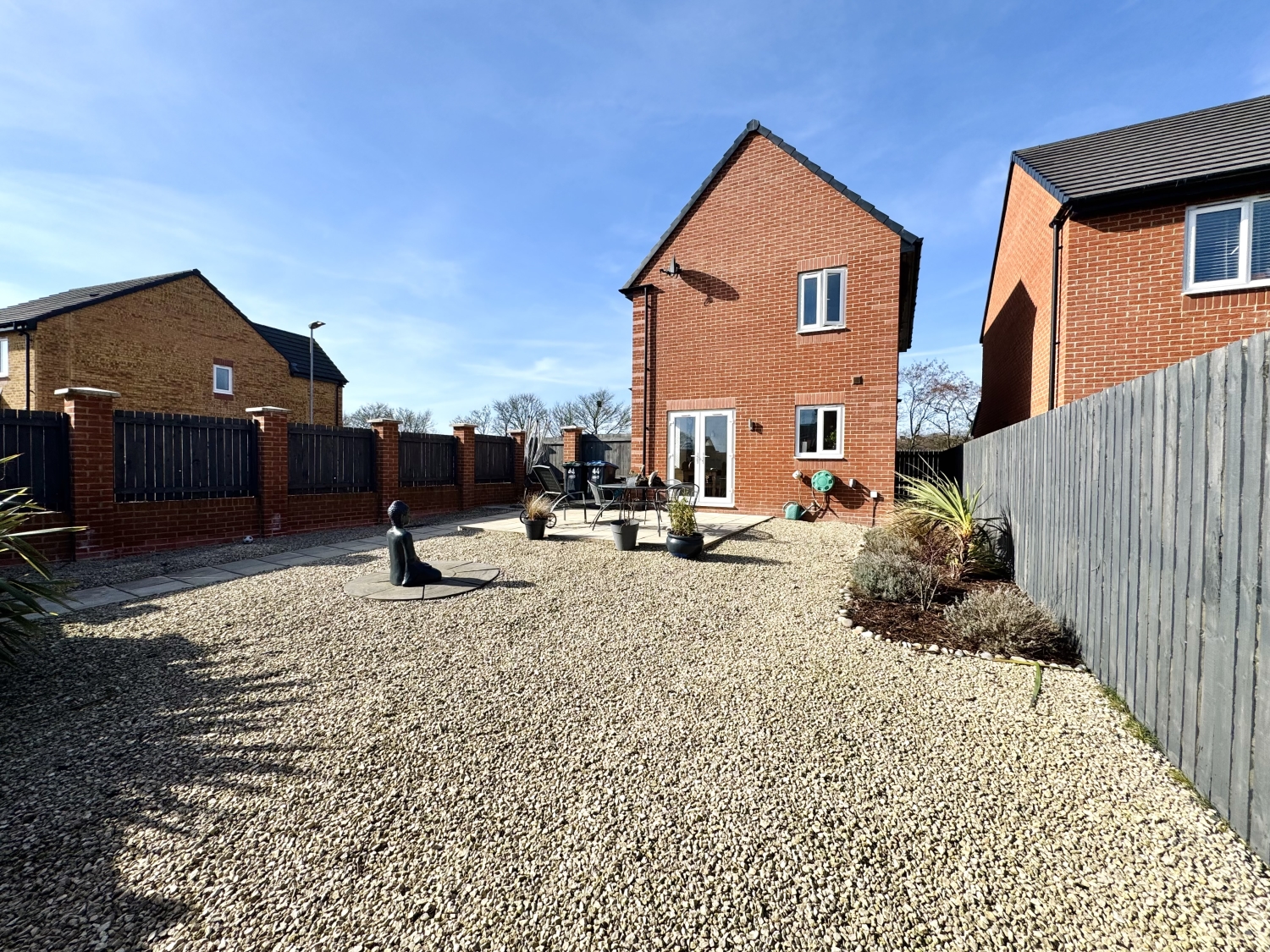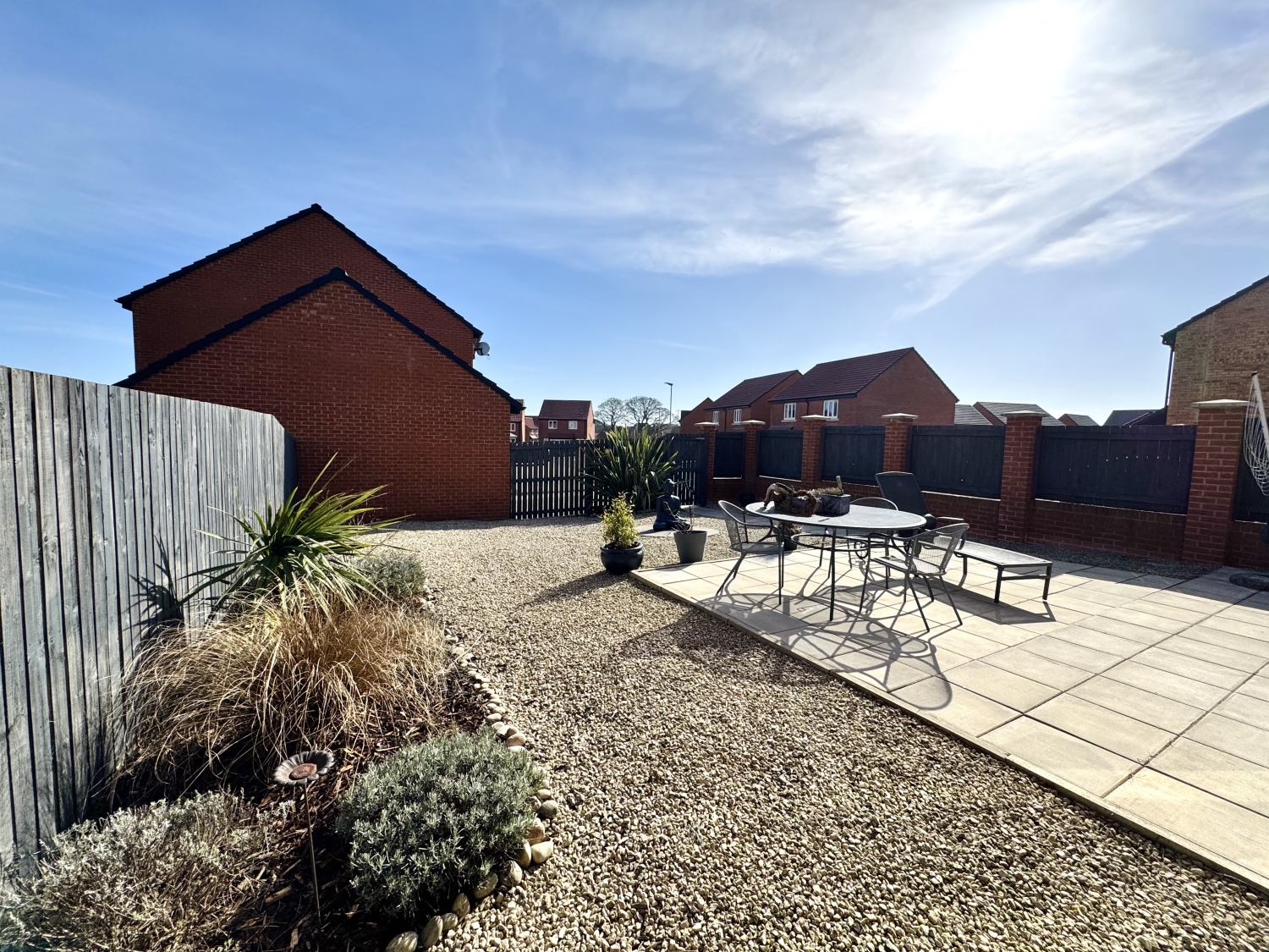 The spacious 15ft living room sits to the front of the home, offering a bright and comfortable space ideal for everyday relaxation. To the rear, the modern kitchen and dining area create a stylish and practical hub for family life, complete with integrated appliances and patio doors that open directly onto the south/west‑facing garden. This sunny outdoor space has been designed for low maintenance, featuring a combination of patio, gravelled areas and established shrubs, making it perfect for enjoying warm afternoons and evening sun.