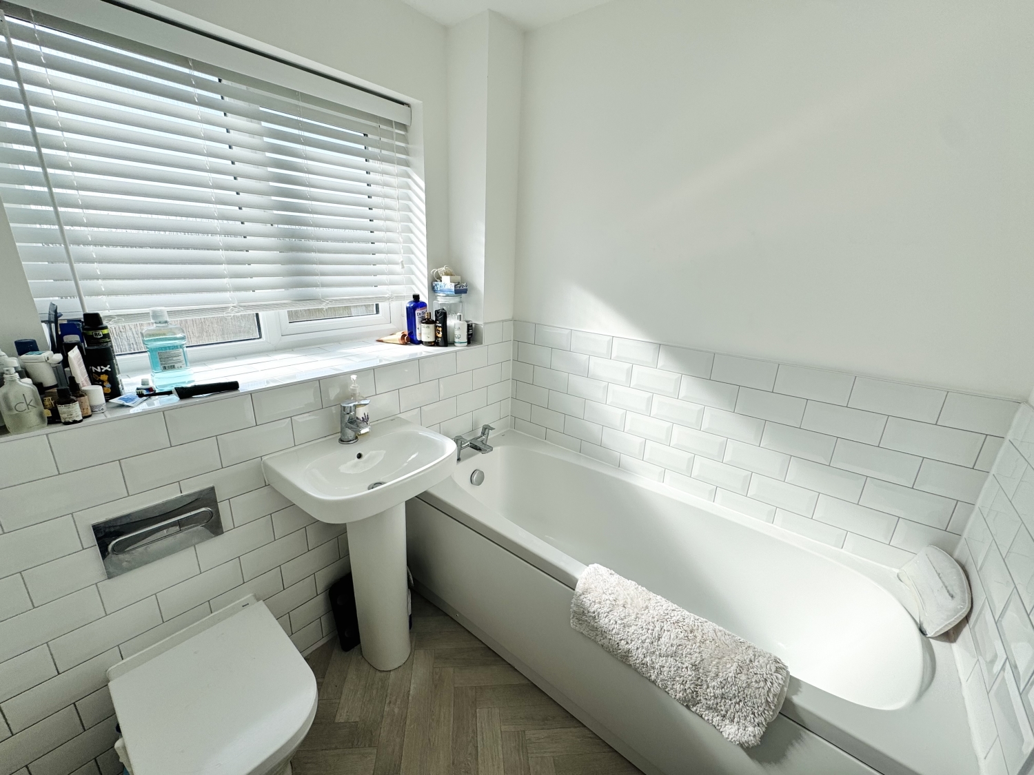 Fitted with a 3 piece suite comprising of; Bath, pedestal wash hand basin, low level w/c, heated towel rail, part tiled walls, double glazed window to the front elevation