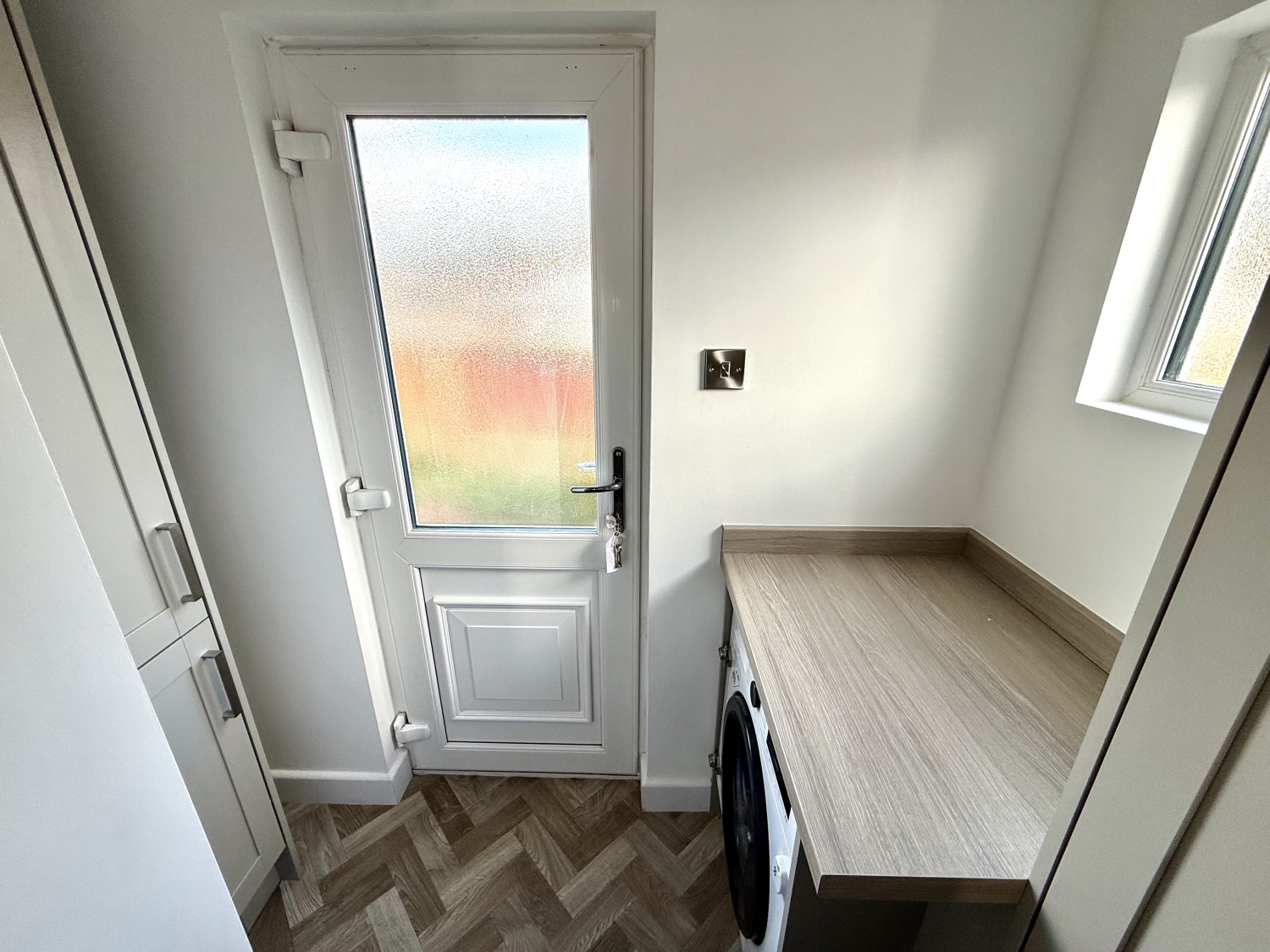 Integrated fridge and freezer, integrated washing machine, larder cupboard, double glazed UPVC frosted window to the side and UPVC external door.