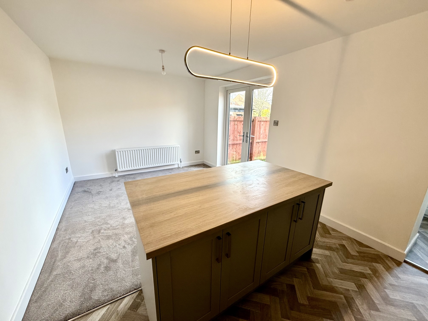 Fitted with an exceptional range of 'sand stone' shaker units, having matching splashback, incorporating a stainless steel sink unit with mixer tap and drainer. Built in oven, microwave, hob and extractor hood, double central heating radiator, double glazed UPVC French doors to the rear and breakfast bar island.