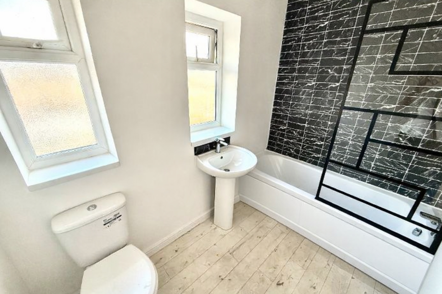 Fitted with a white three piece suite comprising a panel bath with shower screen and shower over, wash hand basin and WC. Two double glazed frosted window to the rear, extractor fan, modern splashback tiling, extractor fan, heated towel rail and downlighters.