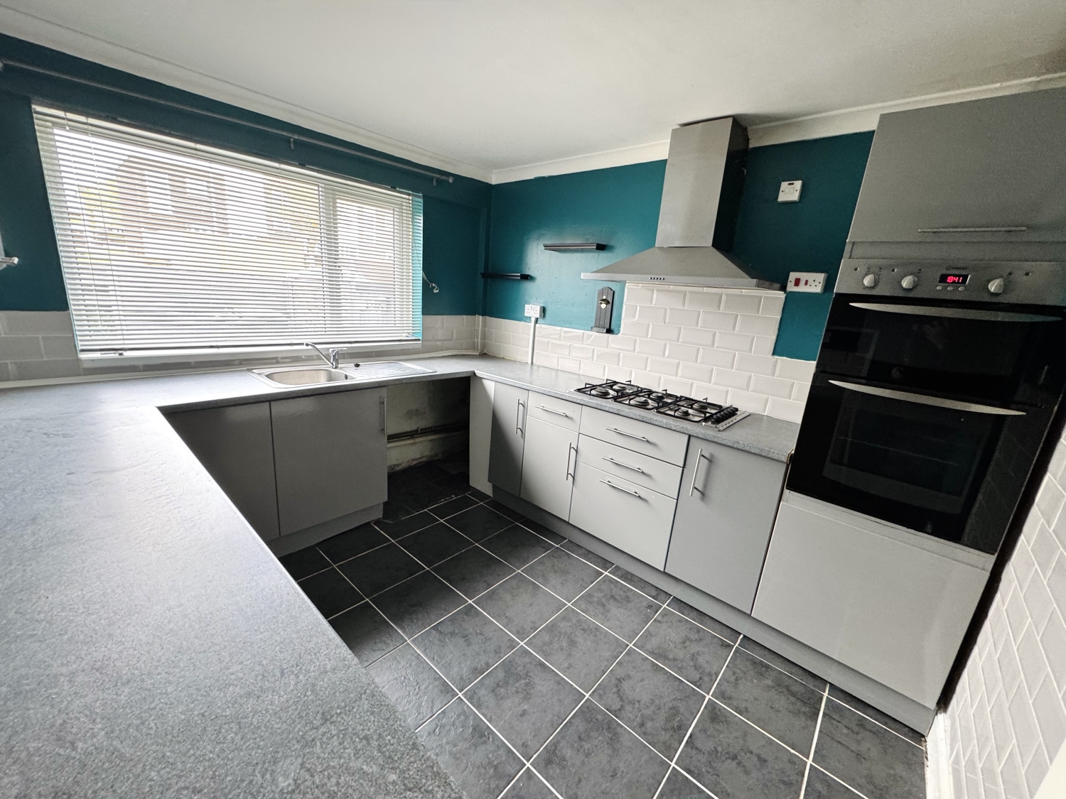 Fitted with a range of wall and base units with complementing work surfaces, splash back tiling, 6 ring gas hob, extractor fan, electric oven, stainless steel sink with drainer and mixer tap, space for fridge/freezer, space for washing machine, space for dryer, double glazed window to the side elevation