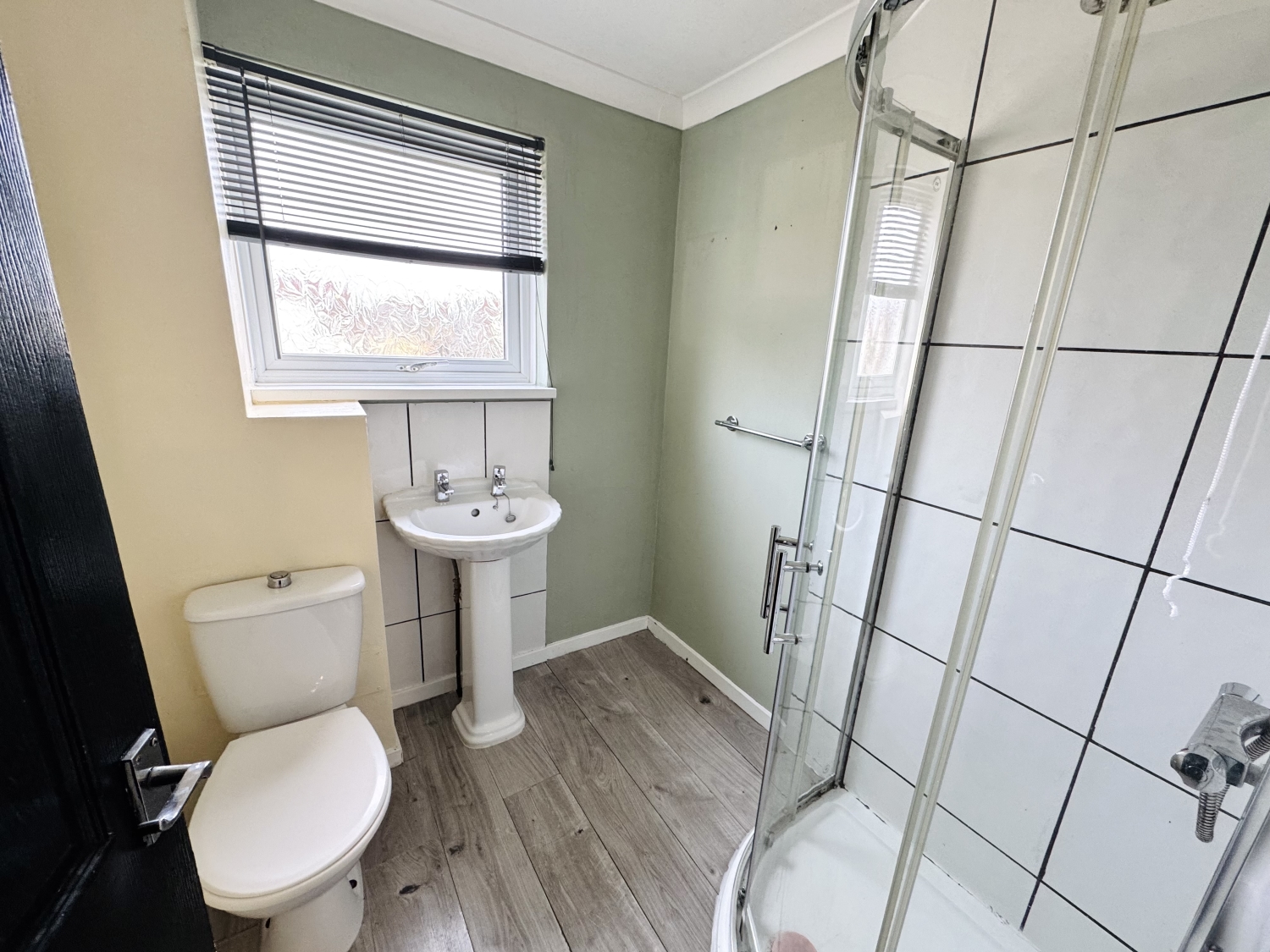 Fitted with a 3 piece suite comprising of; Shower cubicle, pedestal wash hand basin, low level w/c, part tiled walls, double glazed window to the front elevation