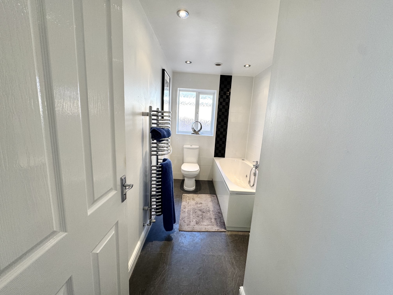 Fitted with a 3 piece suite comprising of; Bath with shower spray attachment, vanity wash hand basin, low level w/c, heated towel rail, part tiled walls, tiled flooring, spotlights to ceiling, double glazed window to the side elevation