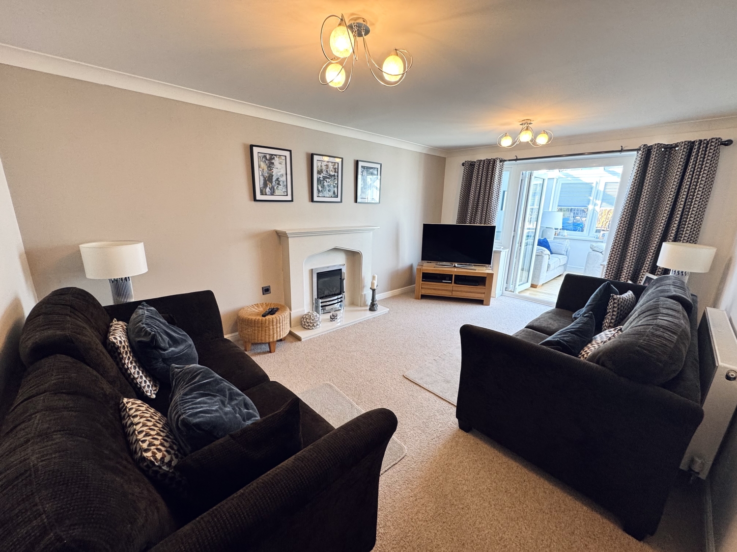 Gas fire with marble surround, radiator, Bi-folding doors into the sun room