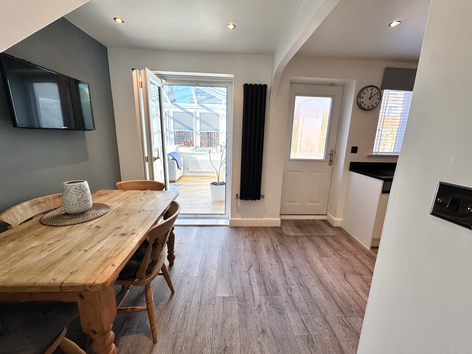 Bi-folding doors into the sun room, radiator, opening into the kitchen