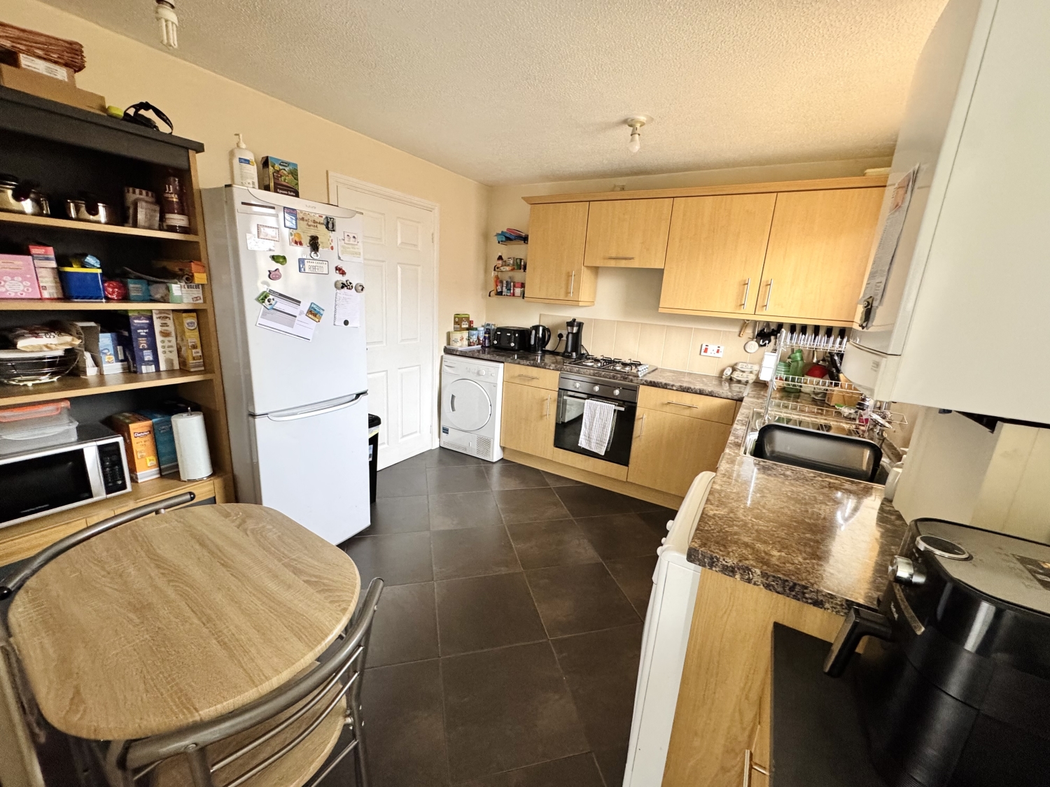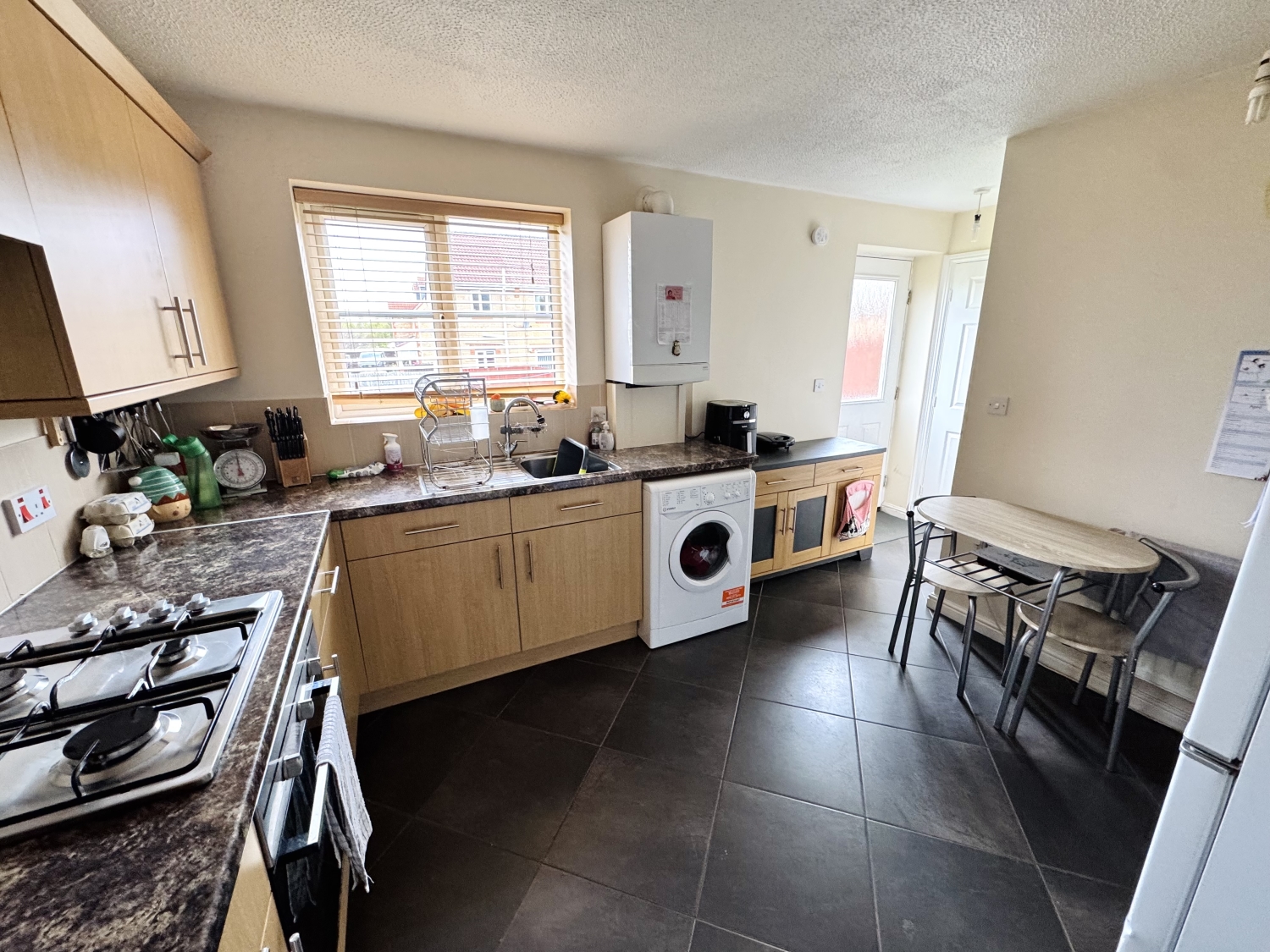 Fitted with a range of wall and base units with complementing work surfaces, splash back tiling, stainless steel sink with drainer and mixer tap, gas hob, electric oven, extractor hood, space for washing machine, space for fridge/freezer, double glazed window to the rear elevation, radiator, upvc door to the rear garden