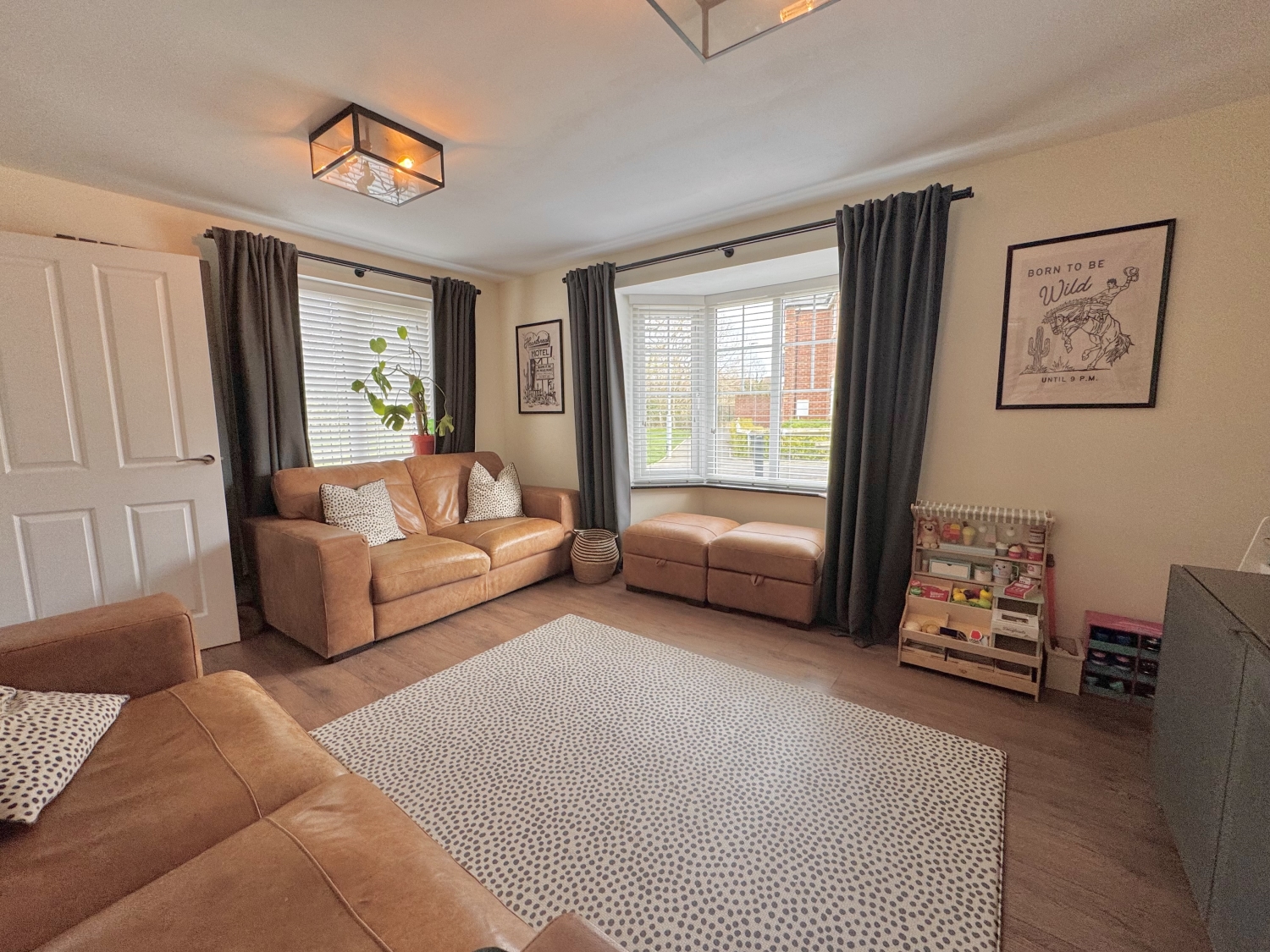 The welcoming entrance hall leads into a bright lounge featuring a charming bay window and useful storage. The contemporary kitchen/diner is fitted with modern units, integrated appliances and opens onto the enclosed rear garden through elegant French doors, creating a perfect space for entertaining. A ground floor WC adds further practicality.