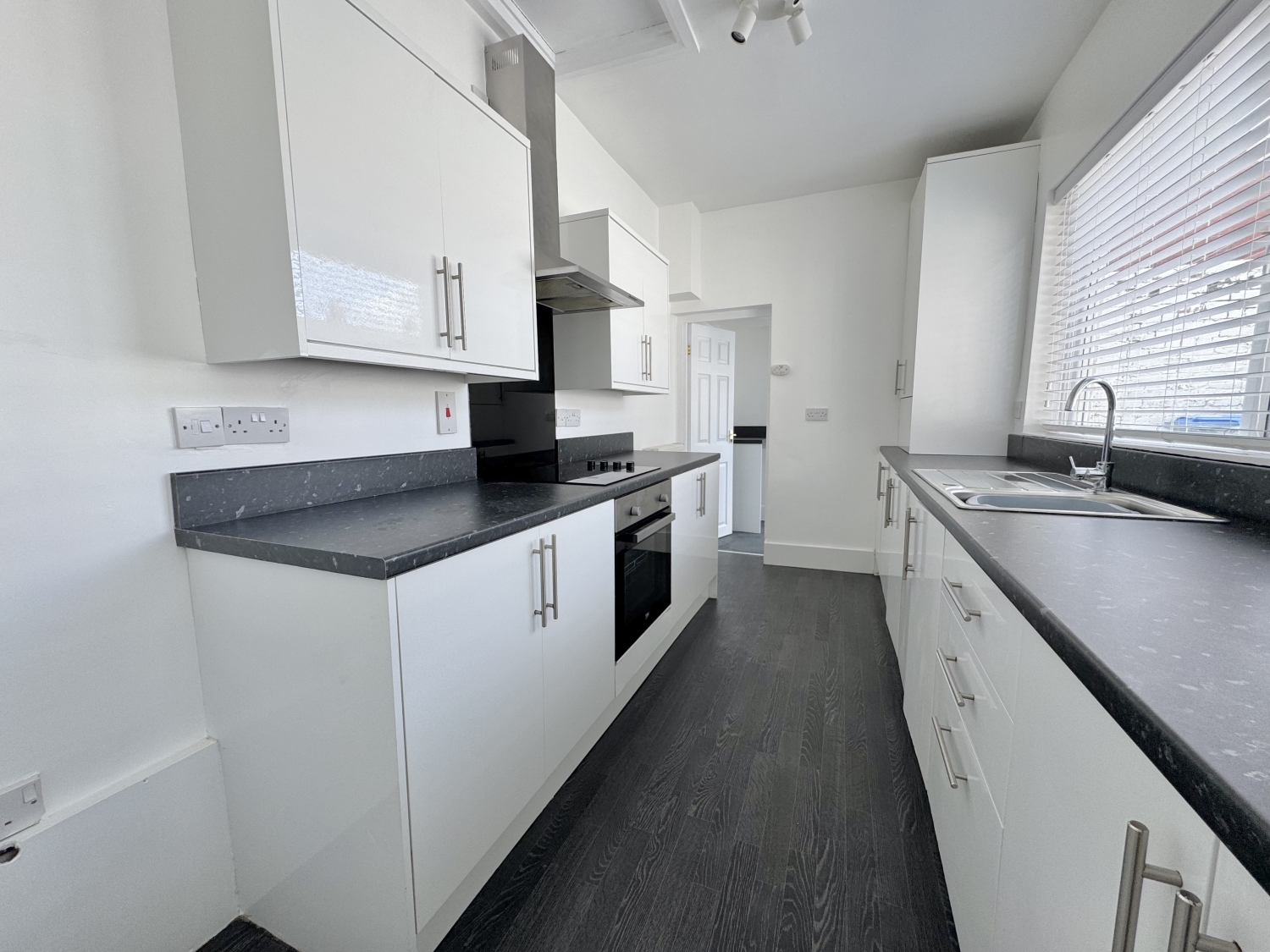 The galley kitchen offers a practical and stylish arrangement of wall and base units, complete with integrated oven, hob and extractor. This flows seamlessly into a useful utility area, with a UPVC double‑glazed door leading out to the private, wall‑enclosed rear yard — perfect for low‑maintenance outdoor enjoyment. A convenient ground‑floor WC adds further practicality.