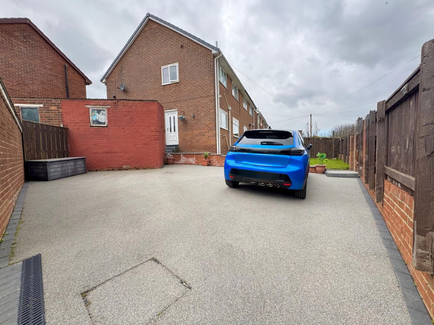Externally, the property enjoys gardens to the front, side and rear. The rear has been finished with resin for low‑maintenance living, complemented by a small lawned area. The generous open frontage provides ample off‑street parking for multiple vehicles, along with a separate garage.