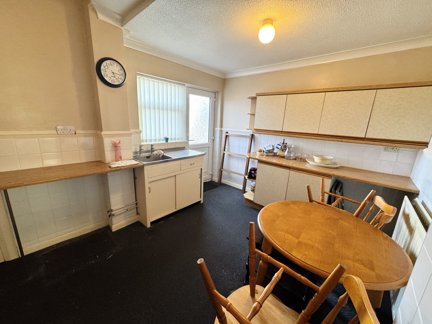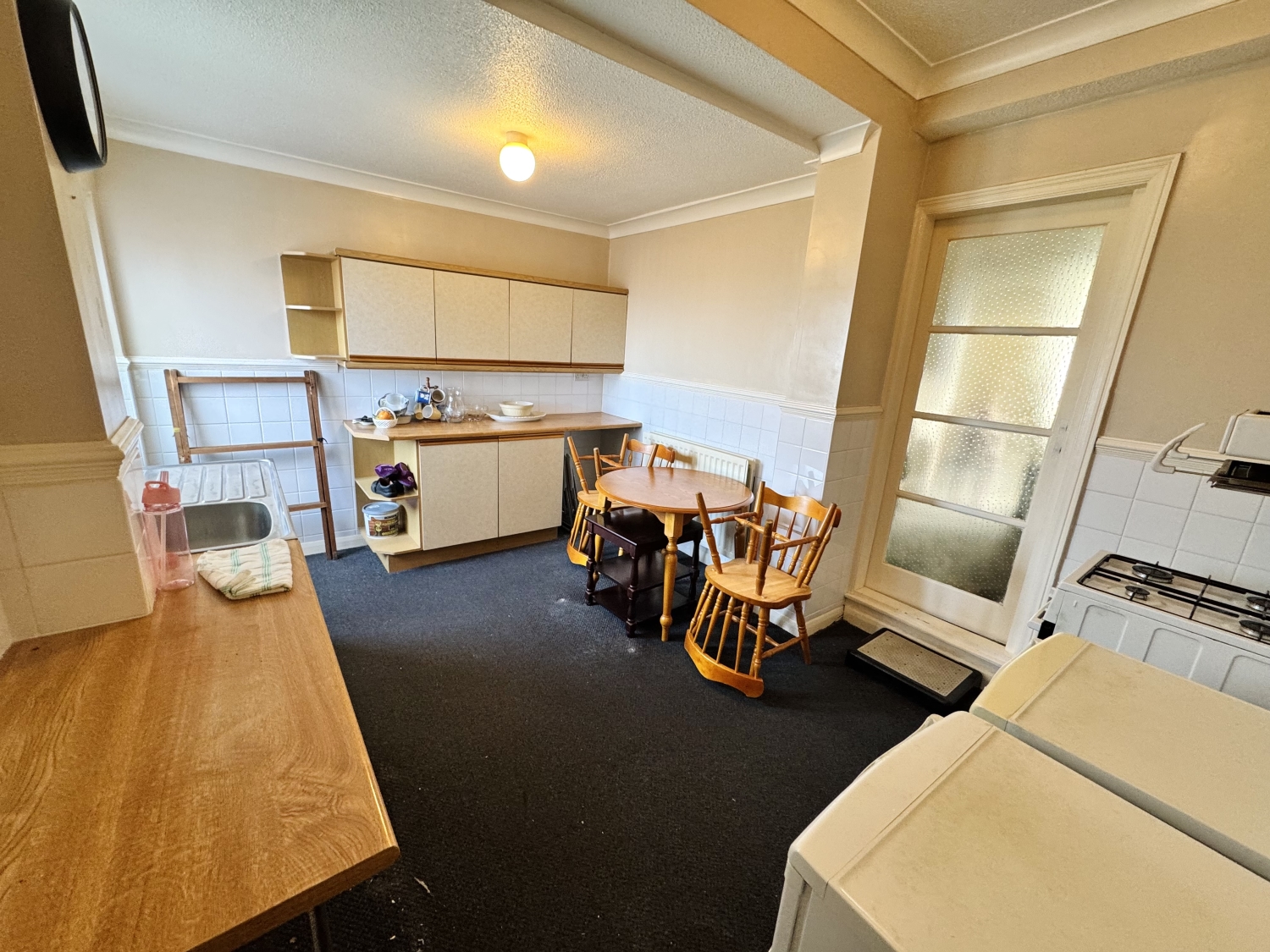 Fitted with a range of wall and base units with work surfaces, stainless steel sink with drainer and dual tap, cooker, space for washing machine, radiator, upvc door to the rear yard