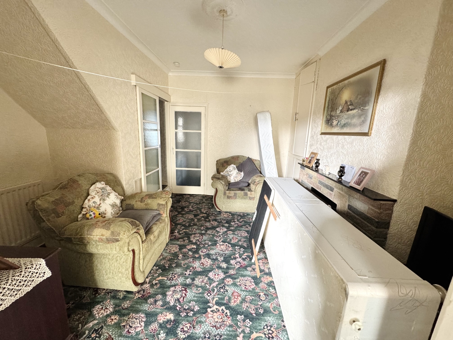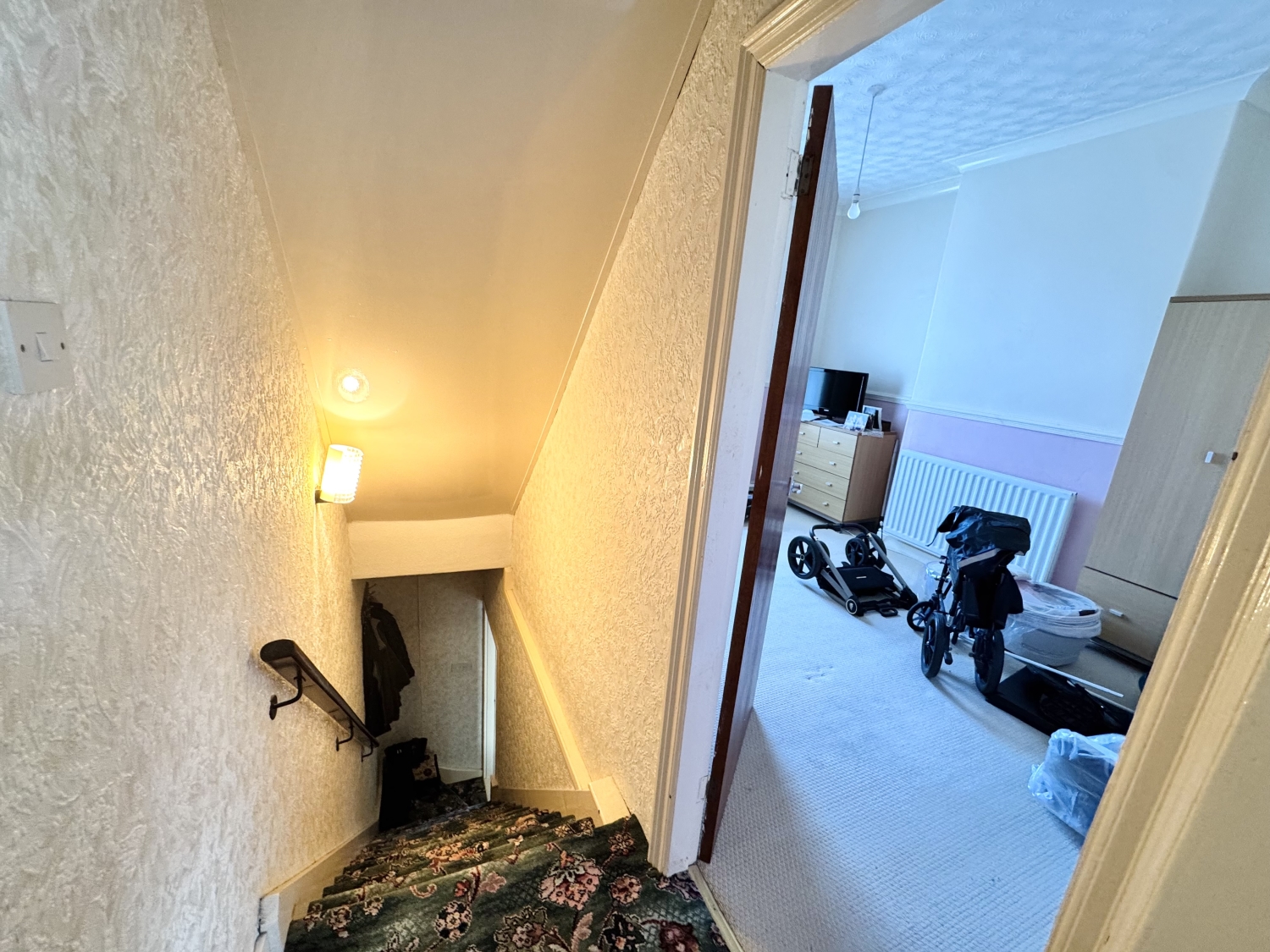 An attractive uPVC entrance door opens directly into a well‑proportioned 14ft living room, a comfortable space with an open aspect into the adjoining dining room. The dining room sits at the centre of the home and features the staircase leading to the first‑floor landing, making it a natural hub for everyday living. To the rear, the extended 13ft kitchen/diner provides ample room for cooking and casual dining, fitted with a second uPVC door that leads out to the enclosed rear yard. Beyond the kitchen is a useful rear hall that connects to the ground‑floor bathroom.