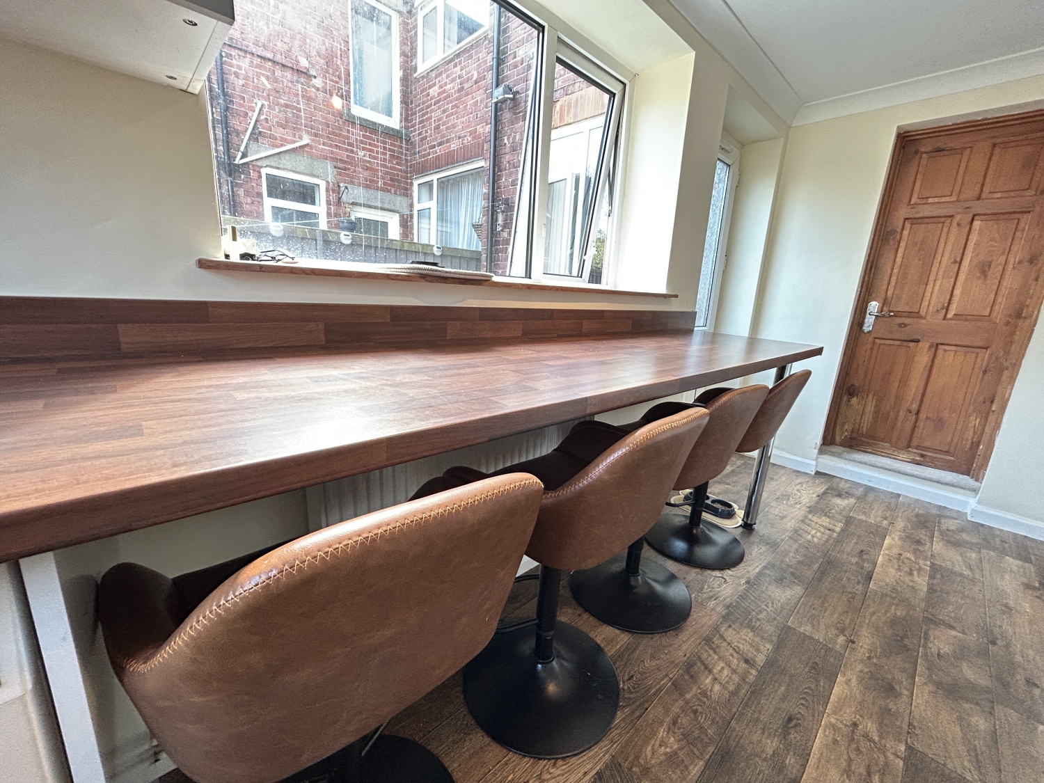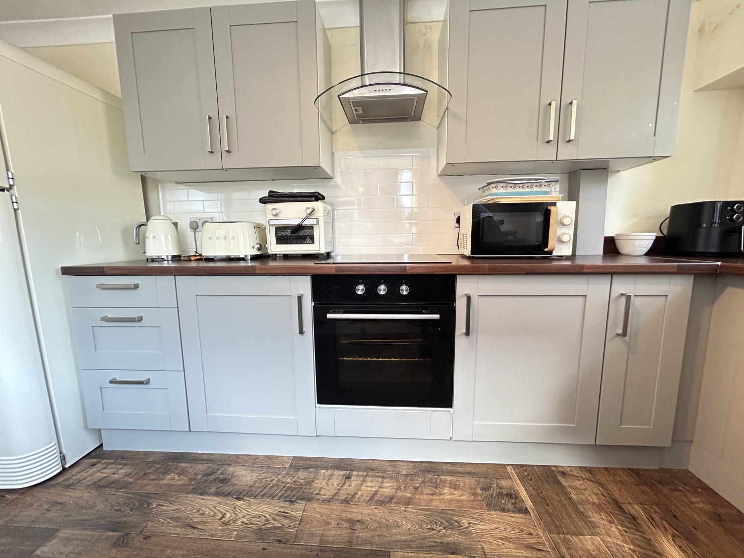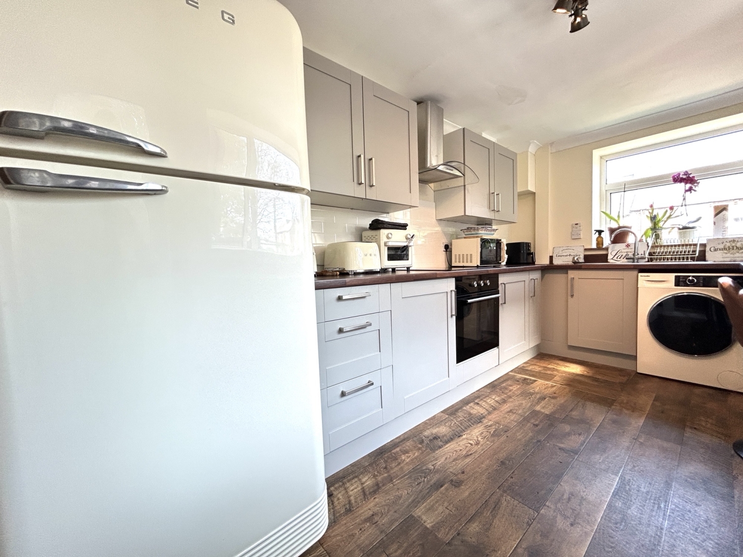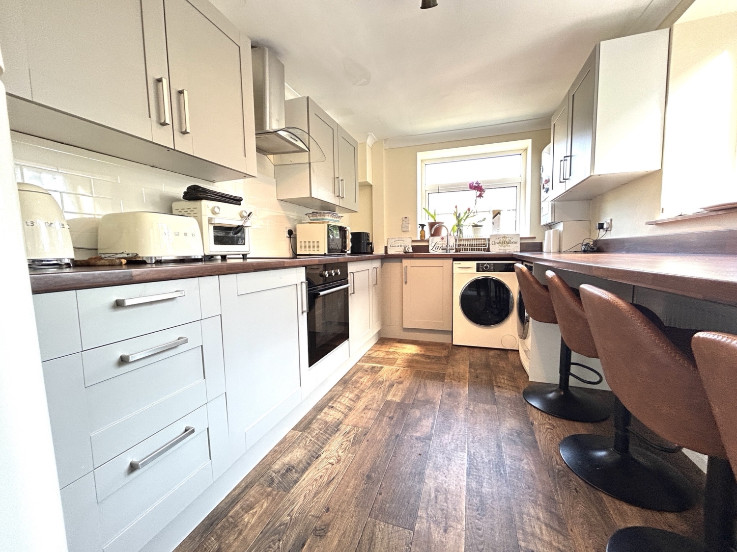 The modern refitted kitchen has been designed with both style and functionality in mind, offering a range of fitted units providing ample storage and worktop space. Integrated cooking appliances include an oven, hob and extractor hood, with additional space available for freestanding appliances. A four-seat breakfast bar provides an ideal area for informal dining and everyday use.