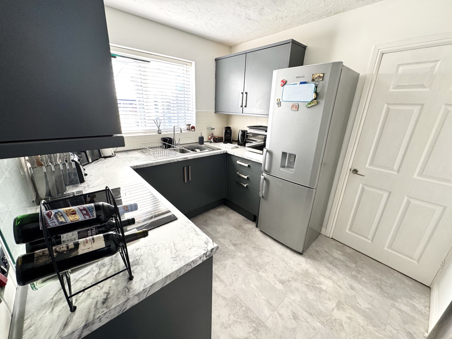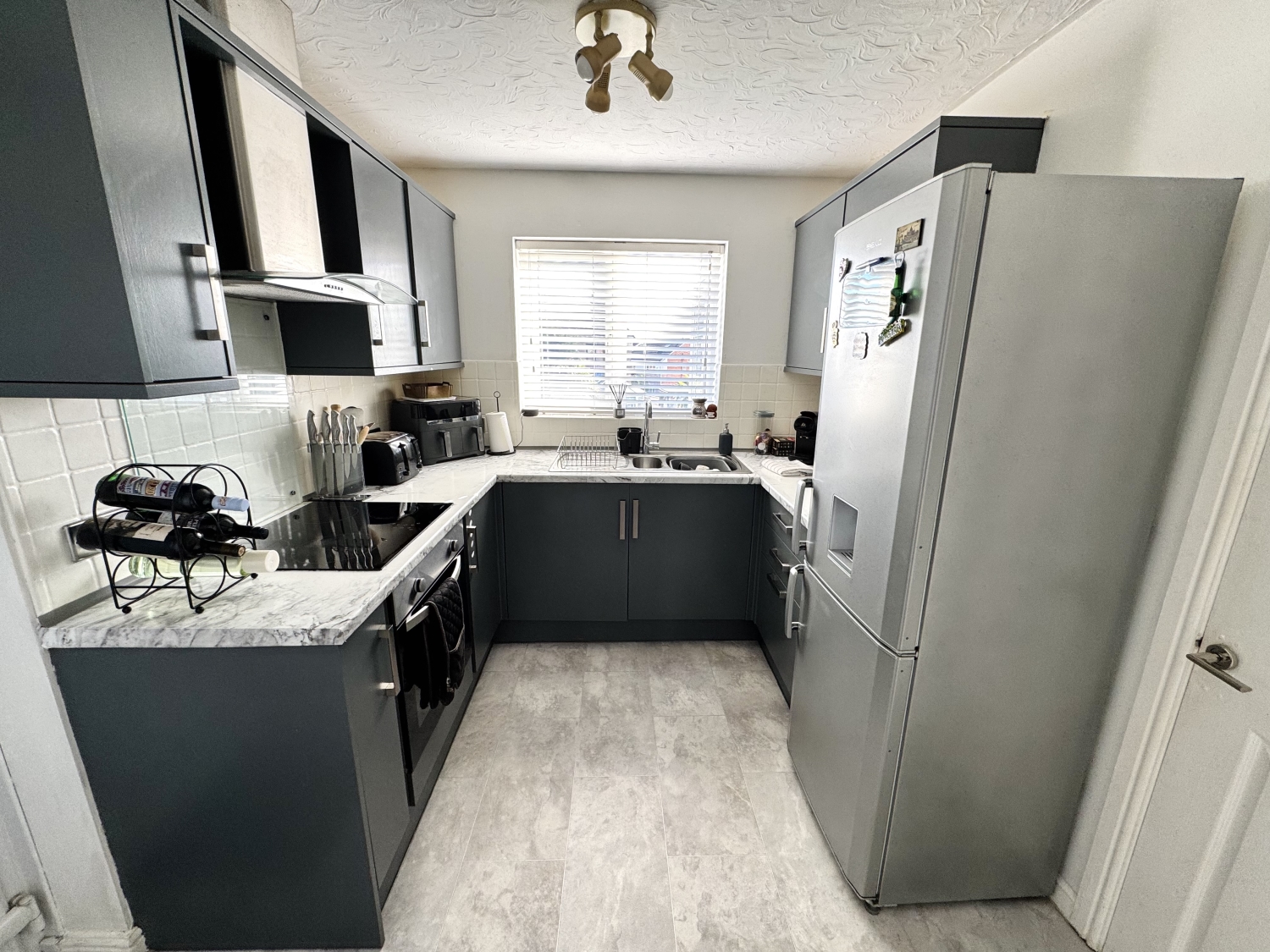 Fitted with a range of wall and base units with complementing work surfaces, electric hob, electric oven, extractor hood, stainless steel sink with drainer and mixer tap, space for fridge/freezer, storage cupboard, radiator, double glazed window to the rear elevation, upvc door to the rear garden