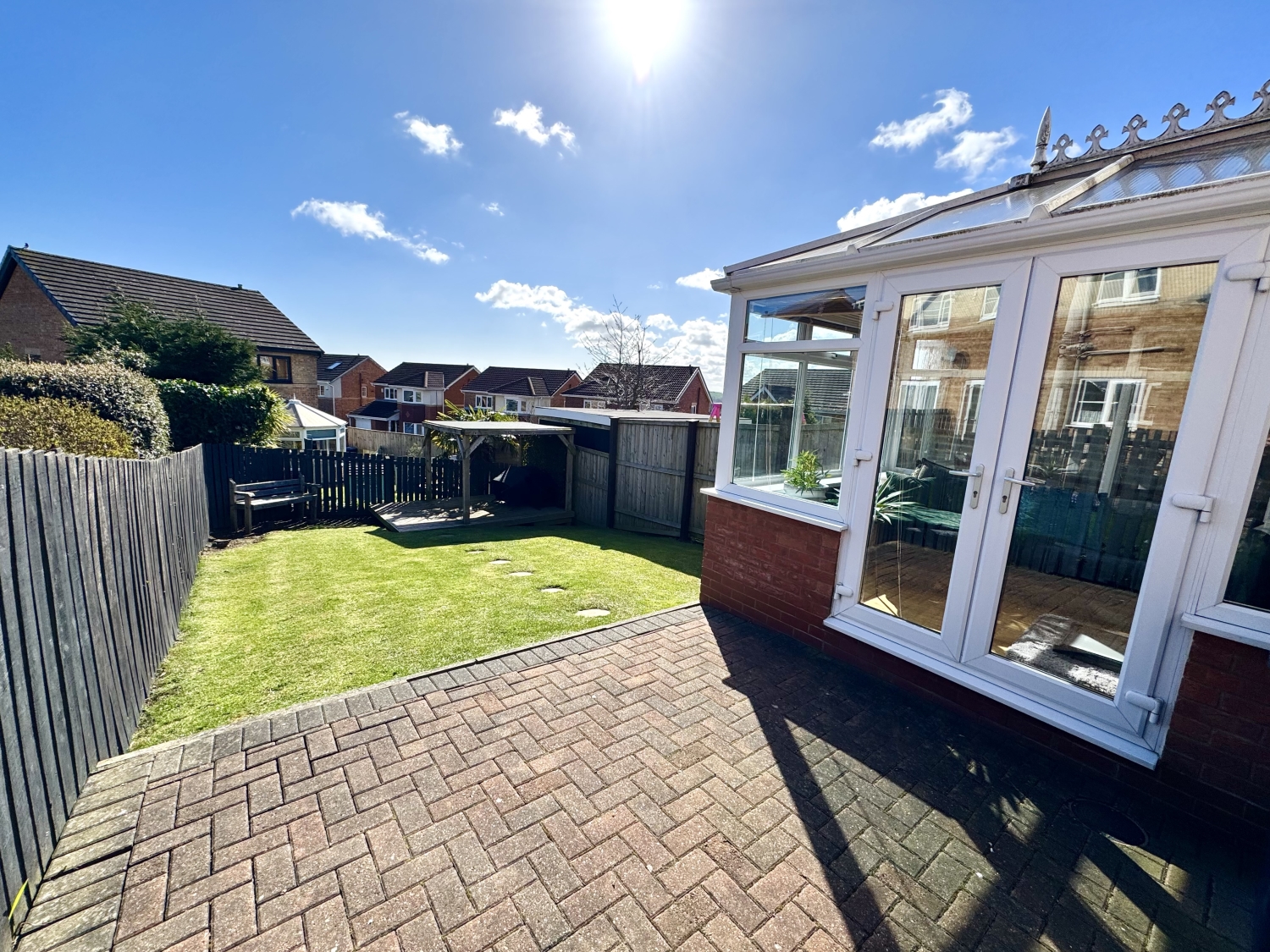 To the rear, the property boasts a substantial lawned garden, perfect for outdoor enjoyment. A block‑paved patio provides an ideal area for seating or entertaining, complemented by a pergola and outdoor lighting that enhance the space and create a charming atmosphere during the warmer months.
