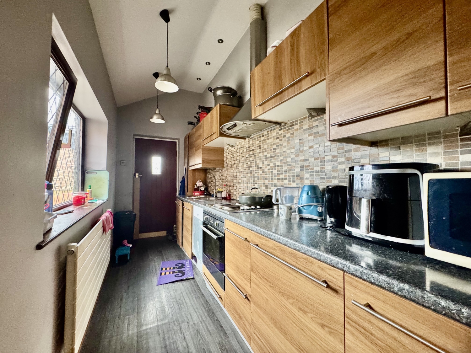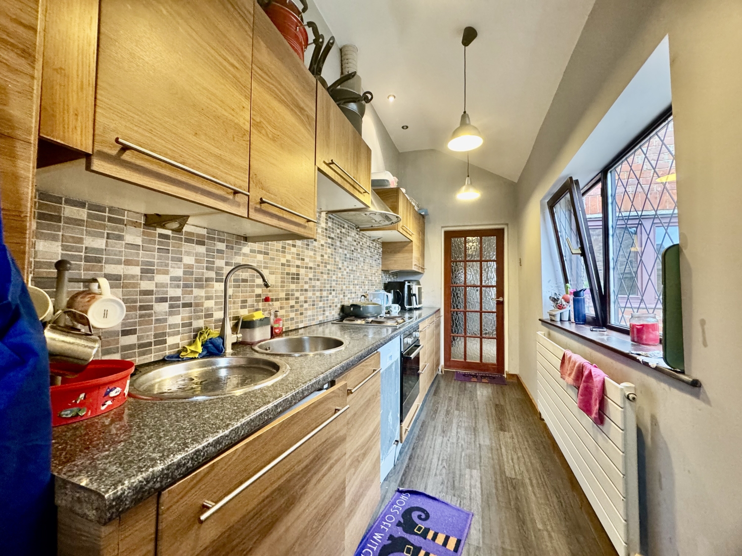Kitchen comprising of wall and base units, four ring gas hob, electric oven, double glazed window to the rear, stainless steel sink unit with mixer tap and drainer, stainless steel extractor fan, door leading through to the dining room.